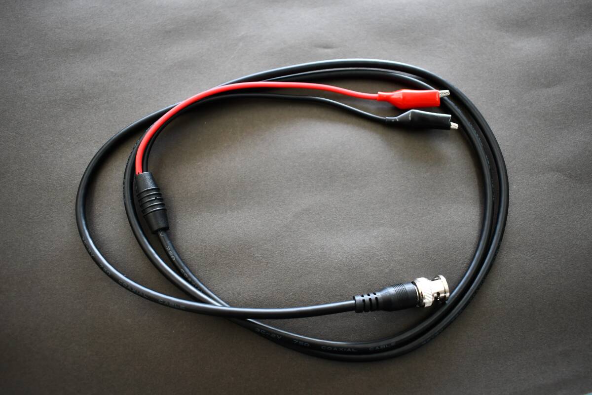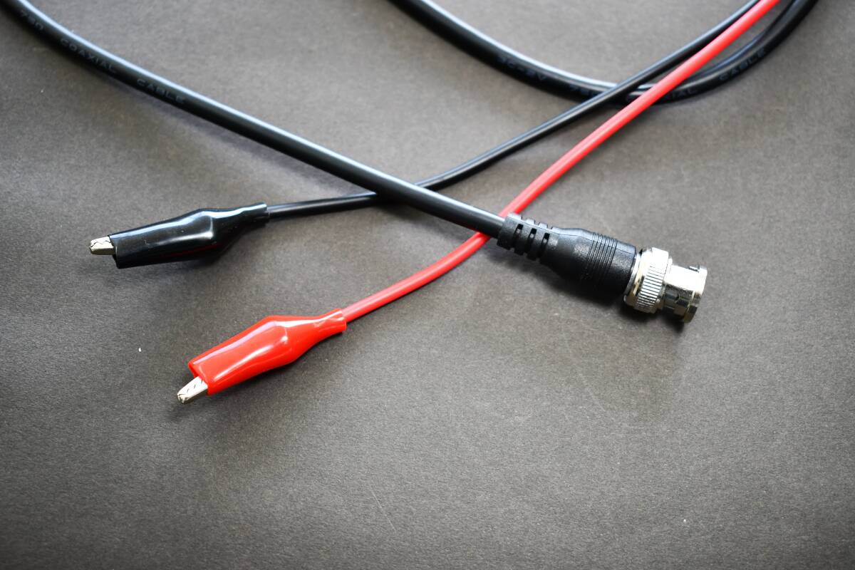 未使用品のワニ口クリップとBNCコネクターの付いた同軸ケーブルです。