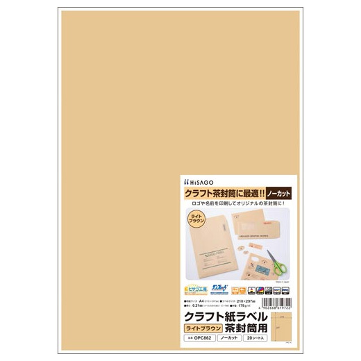 クラフト紙ラベル ライトブラウン 茶封筒用 A4 ノーカット ■ シートサイズ: A4 (210mmx297mm) ■ 厚さ: 0.21mm (ラベルのみの厚さ: 0.11mm) ■ 坪量: 179g/平方メートル ■ 素材: クラフト紙 ■ ラベルサイズ: 210mmx297mm