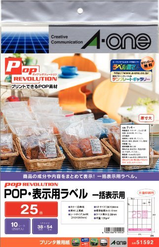プライス・表示などに便利なラベルです。いろいろなプリンタで印刷できます。しっかり貼れてキレイにはがせる粘着剤を使用しています。 / ■入り数:10シート(250片)■面付:25面(5列×5段)■一片サイズ:38×54mm■素材:上質紙■厚み:125g/m2(0.13mm)/薄手■一片サイズ:A4判 (210×297mm)■対応プリンタ:・インクジェット・カラーレーザー・モノクロレーザー・モノクロコピー■用紙特性・マット・キレイにはがせる■顔料インク:対応 / |
