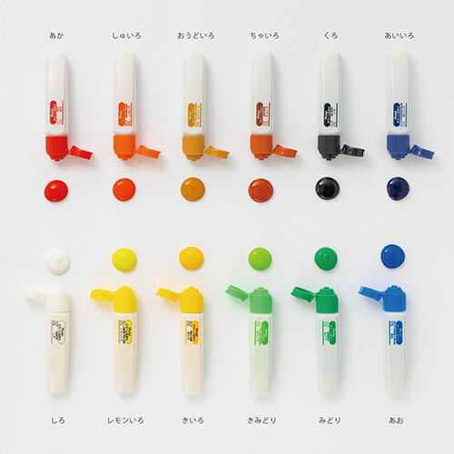 インク色:レモンいろ,おうどいろ,ちゃいろ,しゅいろ,あか,きいろ,きみどり,みどり,あお,あいいろ,くろ各1本,しろ2本