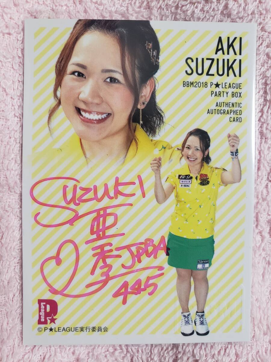 2018年にベースボールマガジン社(BBM社)より発売されたPリーグ「PARTY BOX」に封入されておりました鈴木亜季選手の25枚限定直筆サインカード(ピンクペン版)になります。