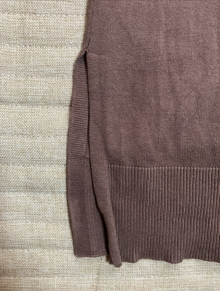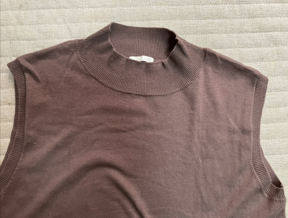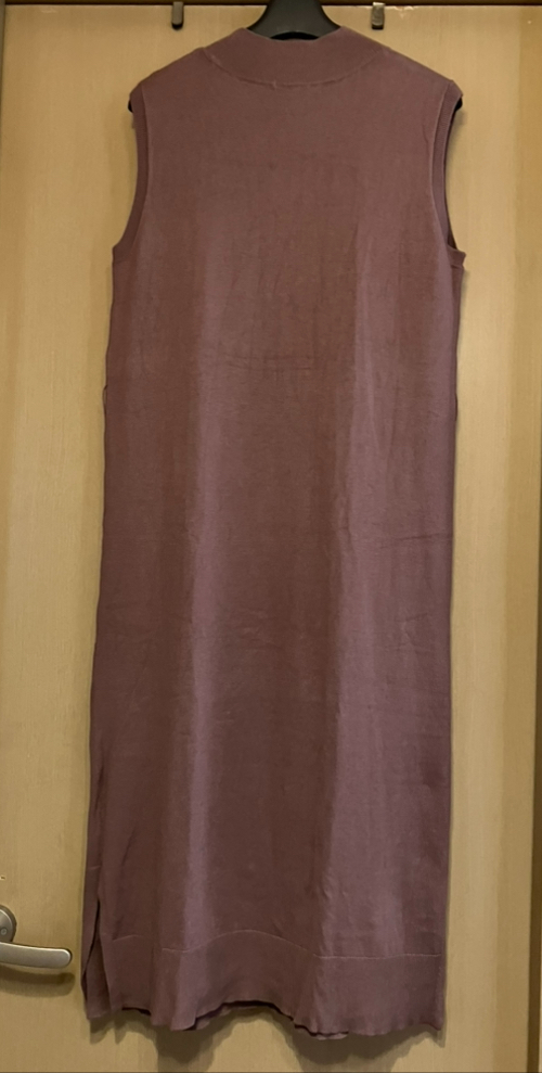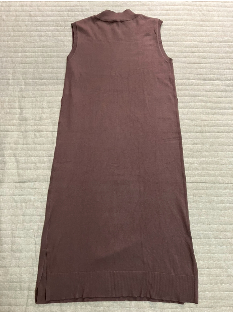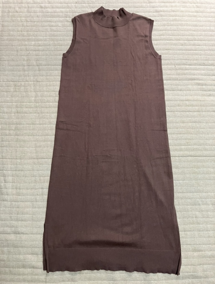落ち着いた合わせやすいブラウン系のノースリーブのタイトニットワンピです。