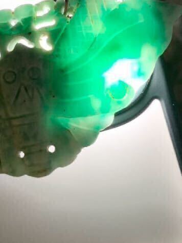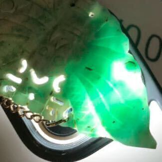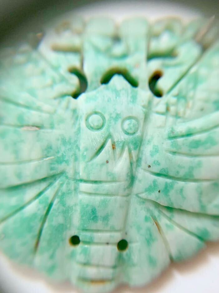 なんとなく個性的な彫刻と古いアンティークな雰囲気が気になって手に取ったところ、「これは翡翠だよ」と言って、店主さんが強い光を裏側から当てて見せて下さった時の、美しく鮮やかに光るグリーンに感動した記憶が未だに忘れられません。当時でヴィンテージ と伺っていたので、今ではアンティークに近いお品かもしれません。