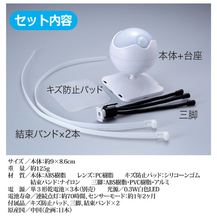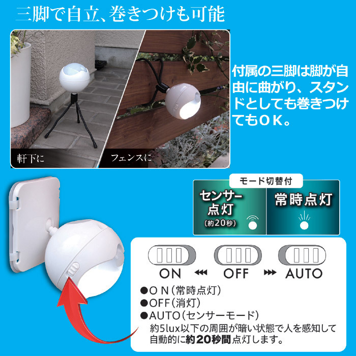 センサーライト 防雨 防水 屋外用 自動感知 点灯 消灯 三脚 LEDライト 照明 玄関 軒先 人感センサー 取り付け簡単 三脚 屋内 庭 ガレージ