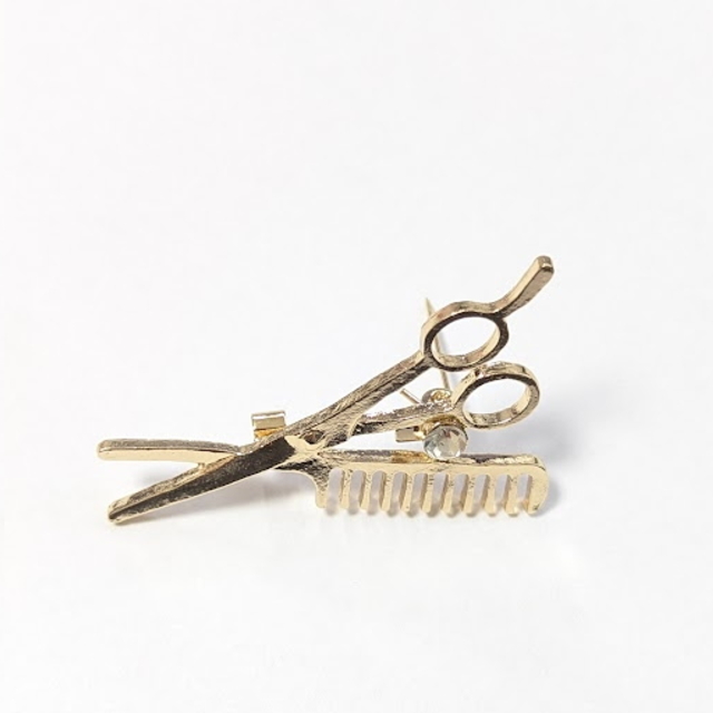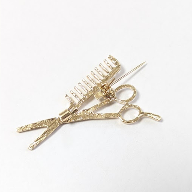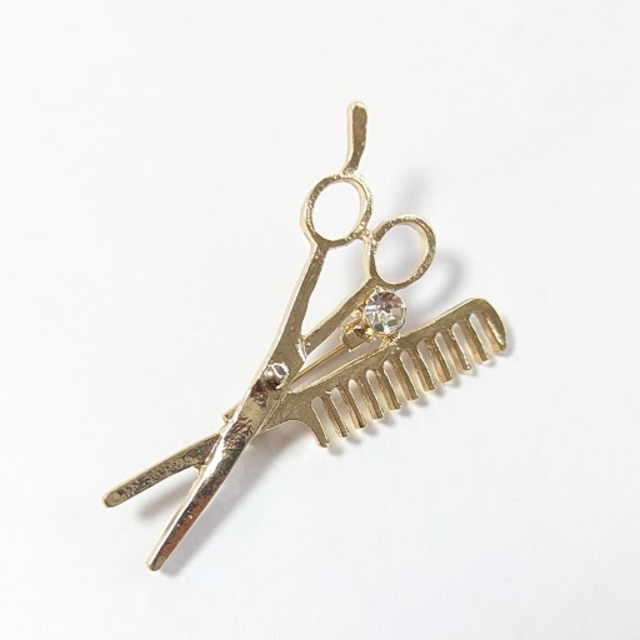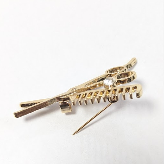 ハサミとくしのラペルブローチ ゴールド ダイヤ風ガラス付 華麗にちょっきん ラペルピン スーツアクセサリー 美容師 はさみ&クシブローチ