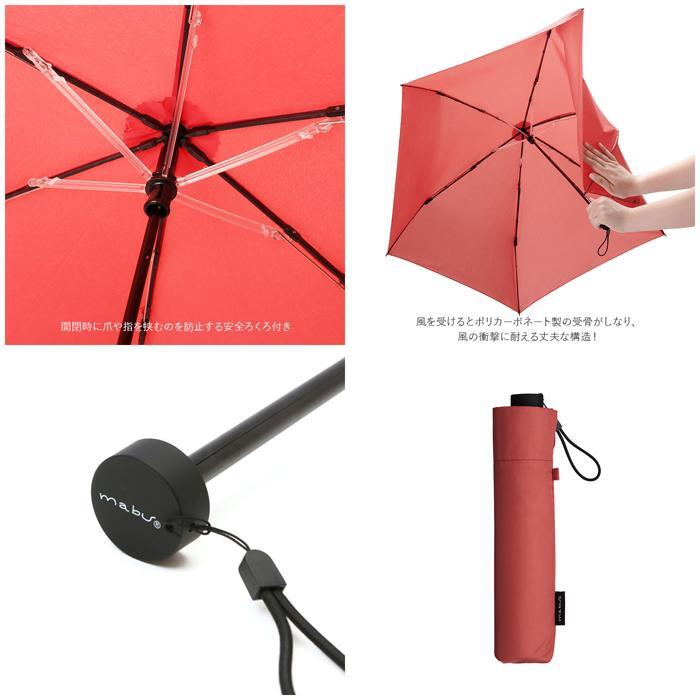 | 商品説明 | ・mabu(マブ)から、軽量なのに風に強い折りたたみ傘「ベーシックライト マルチミニR」が登場。 ・風を受けるとポリカーボネート製の受骨がしなり、風の衝撃に耐える丈夫な構造! ・親骨の一部にしなやかで折れにくいグラスファイバー素材を使用した、6本骨仕様。 ・傘生地には、ペットボトルから再生したリサイクル生地を使用しているから、サステナブル! ・紫外線遮蔽率は90%以上!雨の日だけでなく日差しの強い日も使える晴雨兼用タイプ。 ・開閉時に爪や指を挟むのを防止する安全ろくろ付き。 ・傘生地を留めるバンドは、パチンッと留めやすいスナップボタン式。 ・とっても軽量だから、持ち運びにも便利! ・雨・晴・風とマルチに対応する折りたたみ傘。お気に入りのカラーを選んで♪ |