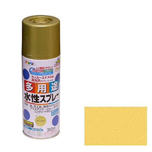 「アサヒペン 水性多用途スプレー 300ML ゴールド」▼4970925565365▼(商品説明)・ゴールド 300ML ・・Color:ゴールドSize:300ML・タレにくく、きれいに仕上がります。・油性塗料や、発泡スチロールに塗っても下地を侵さず、いろいろな素材に使用できます。・乾燥前には水ぶきで落とせて、いったん乾くと日光や雨に強い。・消防法上の非危険物・鉛・クロム化合物を使用していません。説明 乾燥時間:夏期/40~50分 冬期/1~2時間 ●塗り重ね時間の目安: 1回で仕上げずに乾燥させてから2回目を塗装してください。 光沢:ツヤあり/ツヤ消し 下処理方法:■塗る面のゴミ、油分、ホコリ、ワックスをとります。 ■塗料がついて困る周囲はあらかじめマスキングテープや養生シートで覆います。 ■取り扱い中は、必要に応じてマスクや保護メガネ、手袋などを使用してください。 ■新しいコンクリートやモルタルには適しません。