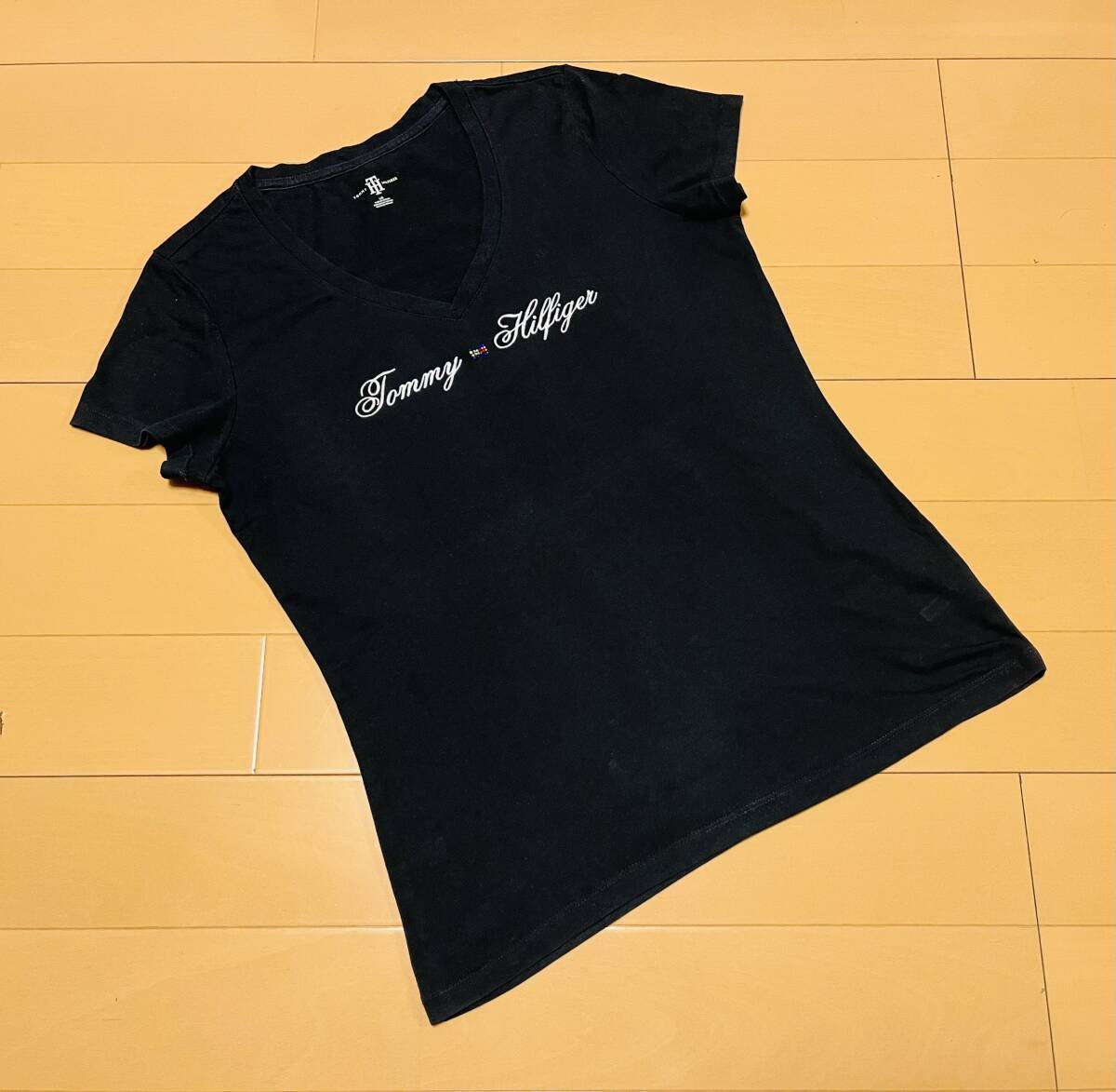 ●○ TOMMY HILFIGER トミー ヒルフィガー ロゴ Vネック ラインストーン Tシャツ L/G ブラック 黒 ○●
