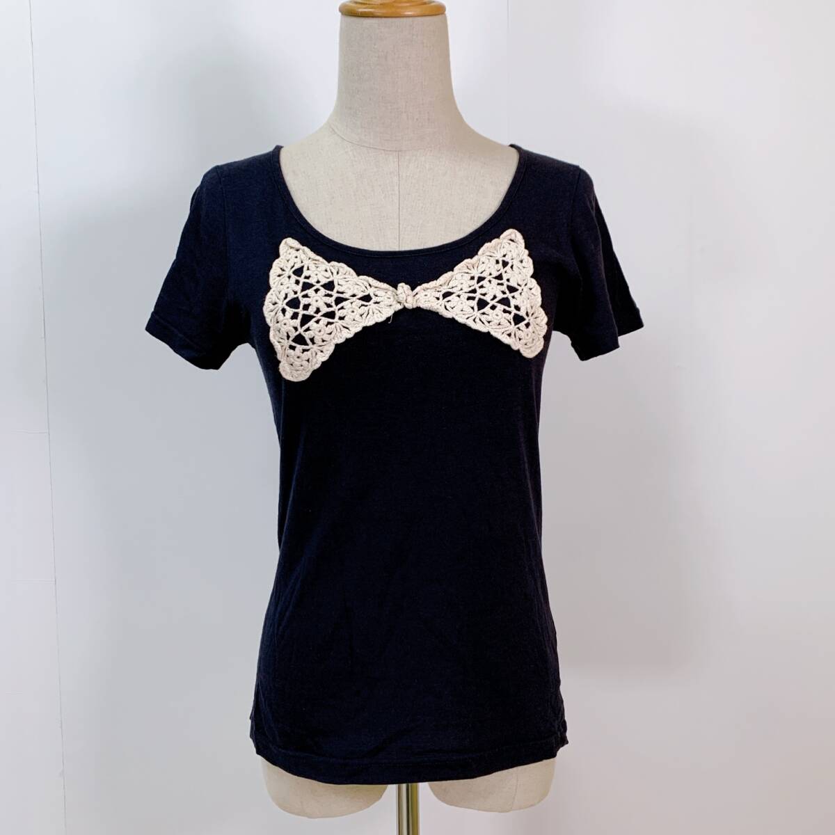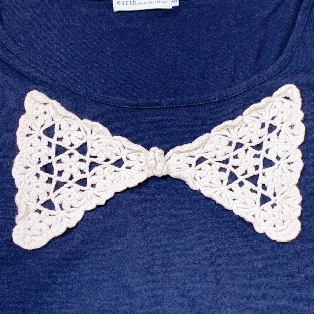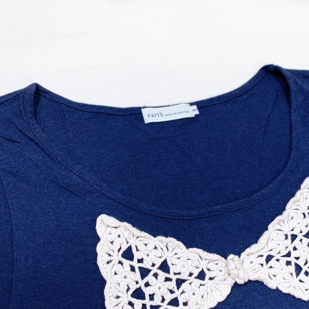 YH1171 earth music & ecology アースミュージックアンドエコロジー レディース 半袖 Tシャツ リボン刺繍 Sサイズ 丸首 万能 USED 古着