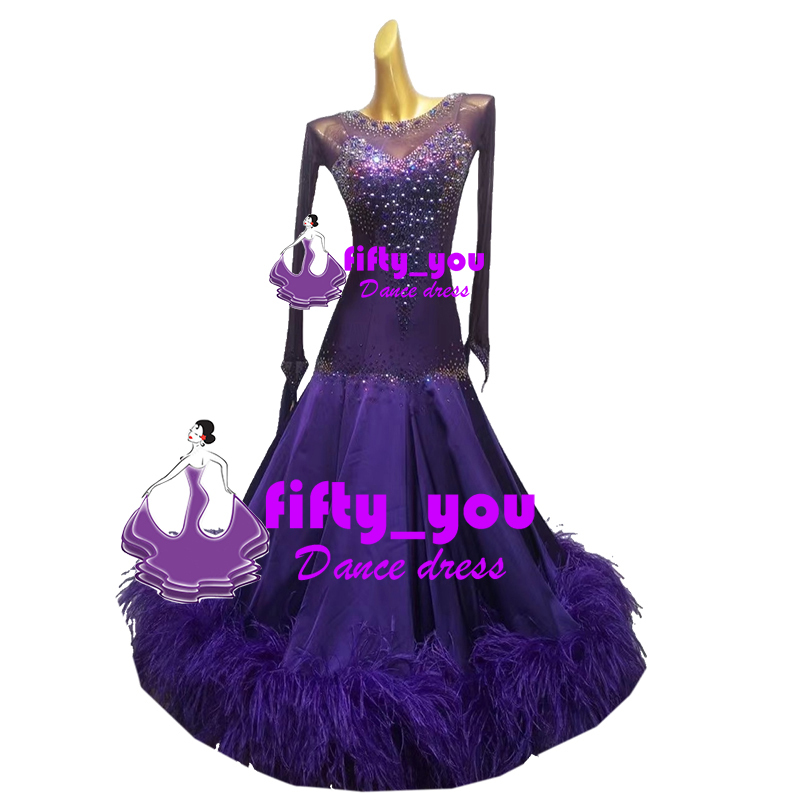 新品fifty_youレディース社交ダンス衣装 サイズセミオーダー モダン競技試合デモ用ドレス  スタンダードドレス  裾ファー飾り パープル