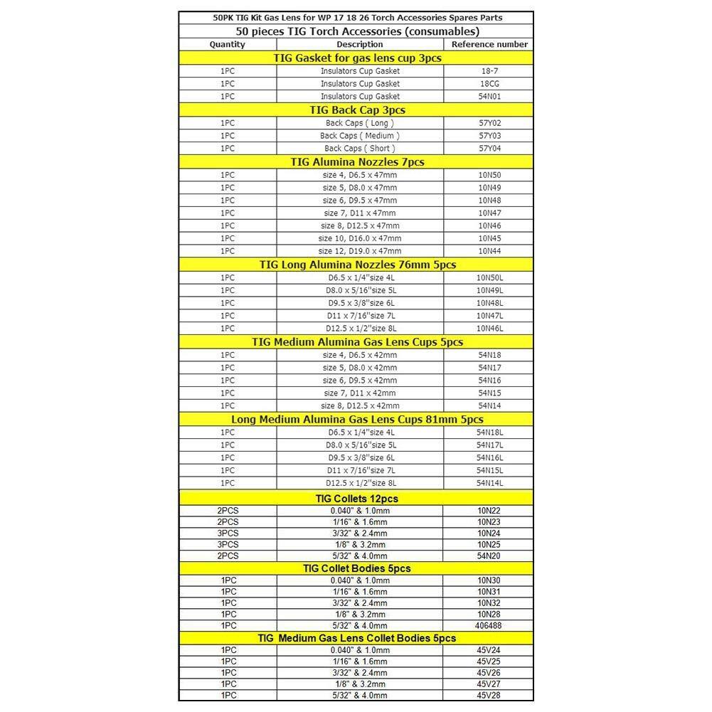 ご覧いただきありがとうございます。 TIG溶接用のアクセサリーセット+タングステン電極棒になります。 ■特徴: ・TIG消耗品 WP-17/18/26 TIG溶接ガンの交換部品となります。 ・お得な50個セットに、タングステン電極棒(WT-20)が 2種類(Φ1.6mm&Φ2.4mm)がセットになったお得なパッケージに なっております。 ・頑丈で高温に強く長寿命です。 ・口径は24mmですので、上記以外の機種にも適合可能です。 ■材質: セラミック ■重量: 約1350g ■数量: 52個セット TIG溶接アクセサリー50個 + 電極棒2種類。 各部品の詳細については画像を参照ください。 タングステン電極棒はWT-20(中国製)が 2種類(Φ1.6mm×150mmと、Φ2.4mm×150mm)が セットになっております。 ■パッケージリスト: TIG消耗品1セット+電極棒セット ご質問等がありましたらお気軽にご連絡ください。 お読みいただきありがとうございました。 |