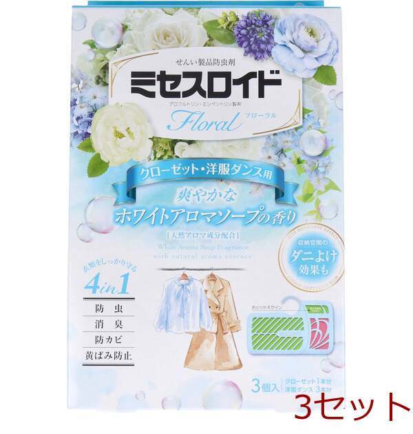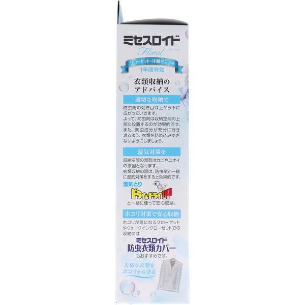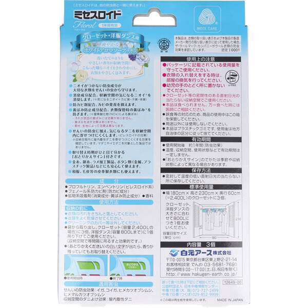 洗いたてのようなやさしい香りのする防虫剤。 洗いたてのようなやさしい香りが収納空間にこもった嫌なニオイをさわやかにし、衣類をやさしく包みます。 ・ニオイがつかない防虫成分が大切な衣類をせんいの虫から守ります。 ・消臭成分配合。 収納空間の気になるニオイ※を消臭します。 (※気になるニオイ=カビ臭・汗臭・体臭) ・防カビ剤配合。 カビの発育を抑えます。 ・黄ばみ防止成分配合。 衣類保管時の黄ばみ※を防ぎます。 (※窒素酸化物(Nox)による黄ばみ) ・汚れが原因の黄ばみには効果がありません。 ・黄ばみを消す効果はありません。 ・素材、生地によって効果は異なります。 ・せんいの防虫に加え、気になるダニを収納空間内に寄せつけにくくします。 (ピレスロイドの効果) ※収納空間内に屋内塵性ダニを寄せつけにくくする効果を確認しています。 ※マダニやイエダニを対象とした製品ではありません。 ・取り替え時期がひと目で分かる「おとりかえサイン」付きです。 ・金糸、銀糸、ラメ加工製品、ボタン類(金属、プラスチック製品)などにも安心して使えます。 ・和服、毛皮等の皮革製衣類にも使えます。 個装サイズ:140X225X53mm 個装重量:約159g 内容量:3個入 製造国:日本 【発売元:白元アース株式会社】 【成分】 プロフルトリン、エンペントリン(ピレスロイド系) フェノール系防カビ剤(防カビ成分) 鉱物系吸着剤(消臭成分・黄ばみ防止成分) 香料 【適用害虫】 せんいの防虫効果:イガ、コイガ、ヒメカツオブシムシ、ヒメマルカツオブシムシ 収納空間のダニよけ効果:屋内塵性ダニ 【使用方法】 ★収納の前に ・衣類の汚れをきちんと落としてください。 ・衣類をよく乾燥させてください。 ・クリーニングのカバー等は外してください。 (1)袋から取り出し、クローゼット(容量2400Lの場合)に3個、洋服ダンス(容量800Lまで)に1個吊り下げてご使用ください。 (収納空間で等間隔に吊るすと効果的です。) (2)「おとりかえください」の白い文字が出たら、香りが残っていてもお取り替えください。 【有効期間】 ・使用開始後:約1年間(防虫効果) ・温度、収納空間、使用状態などで有効期間は一定しません。 ・「おとりかえサイン」のでかたは季節や収納状態によって異なる場合があります。 【保存方法】 ・密封して温度の低い直射日光の当たらない所に保存してください。 【標準使用量】 ・幅180cm×高さ230cm×奥行60cm(=2400L)のクローゼットに3個 ・クローゼット、洋服ダンスの大きさにあわせて800Lにつき1個お使いください。 【使用上の注意】 ・パッケージに記載されている使用量を守ってご使用ください。 ・衣類の入れ替えをする時は、部屋の換気を行ってください。 ・幼児の手のとどく所に置かないでください。 ・クローゼット等の密閉性のある直射日光の当たらない収納空間でご使用ください。 ・本品は食べられません。 万一食べた時には医師にご相談ください。 ・誤食等の対応のため、商品の使用中は箱を保管してください。 ・用途以外には使用しないでください。 ・本品はプラスチックゴミです。 使用後は地方自治体の区分に従って捨ててください。 注意事項 予告なく成分・パッケージが変更になることがございます。 予めご了承ください。 *予告なく成分・パッケージが変更になることがございます。予めご了承ください *ダンボールを使用して発送する場合には、入数以下の個数の場合、 中古ダンボールを使用する場合があり、ご注文の商品とは異なるダンボールになる場合があります。 あらかじめ、ご了承ください。 |
