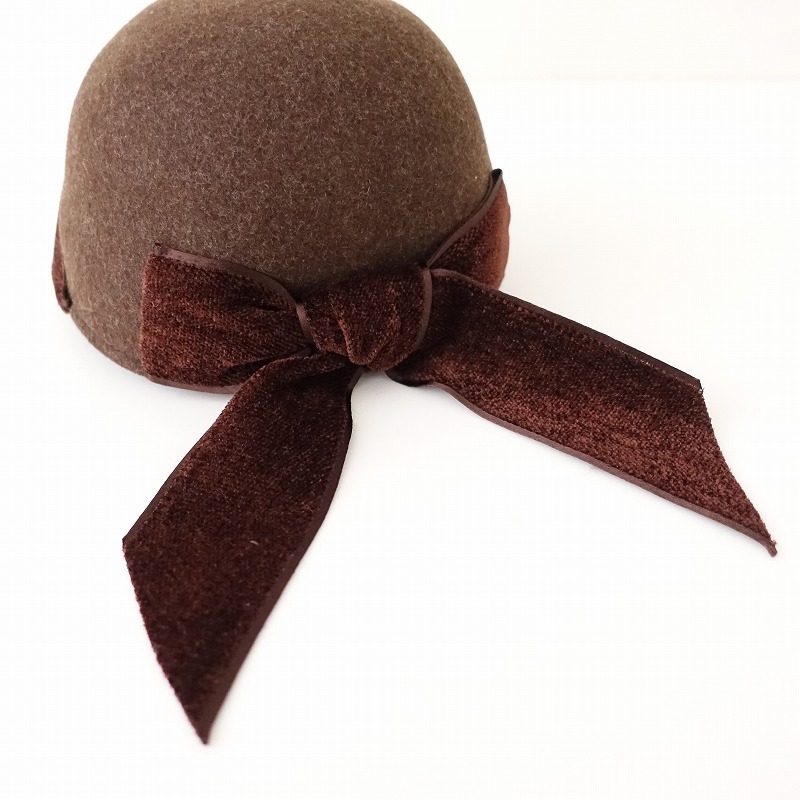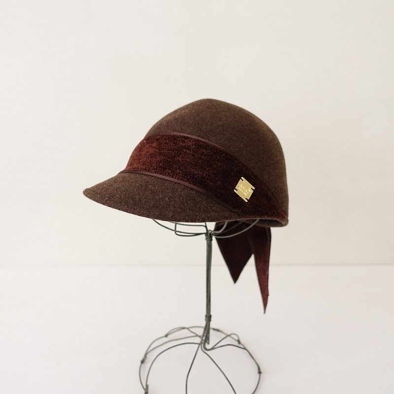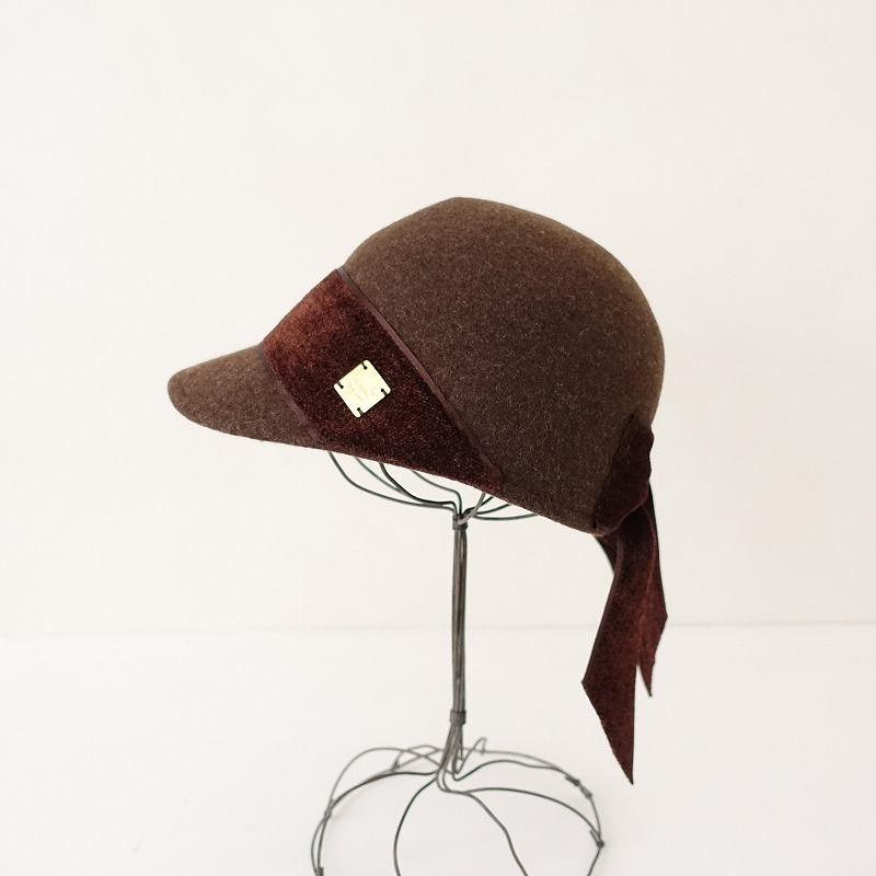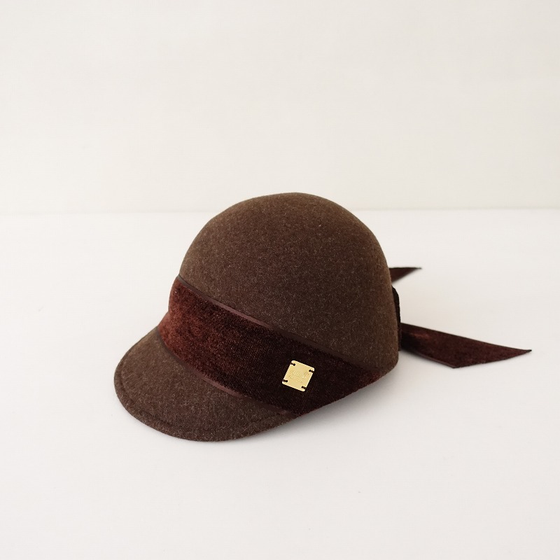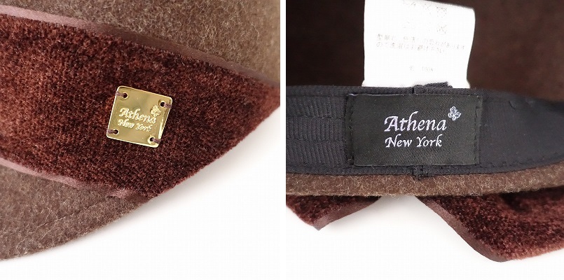 Athena New Yorkのユナイテッドアローズ別注 AGTHA キャップです。カラーはブラウンで、ウールフェルト素材であしらわれており、ワイドリボンが映えるデザインです。被り口はマジックテープで調節可能で、定価(メーカー希望小売価格)25,300円の商品です。 |