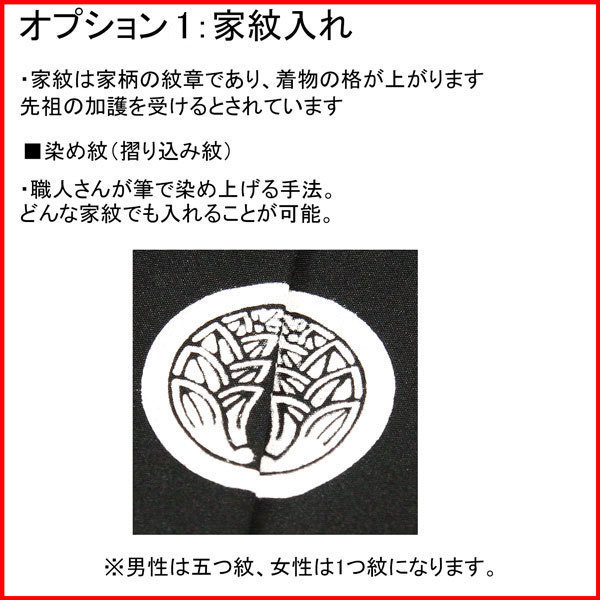 | 紋入れ フードセット | ・紋入れ可能です。 別途6600円にて承ります。 5日間ほどお時間をいただきます。 ※家紋は染め紋(摺り込み紋)になります。 ・フードセットも同梱可能です 別途4800円でご用意できます。 ※ご要望のお客様は家紋名もしくは、フードセット同梱希望をご明記のうえ、フォームもしくはメールaji_net@khaki.plala.or.jp までご連絡ください |