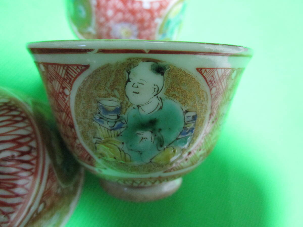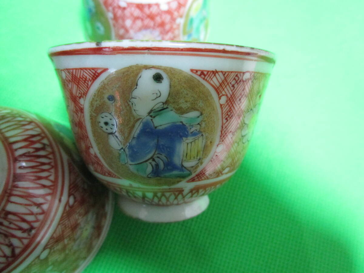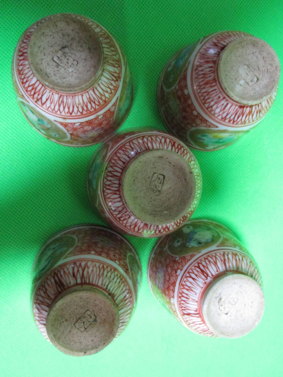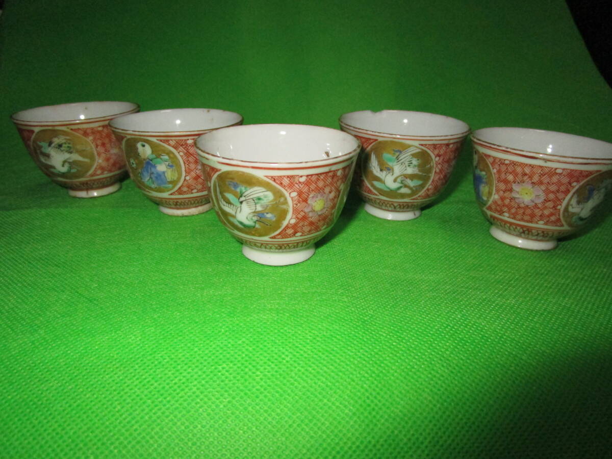 お茶屋さん蔵出し 九谷焼 赤絵 丸窓 茶碗 五客 骨董 昭和レトロ 訳アリ