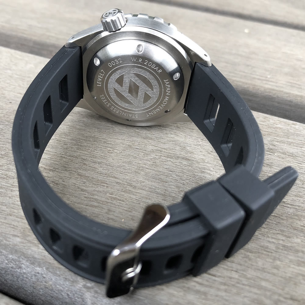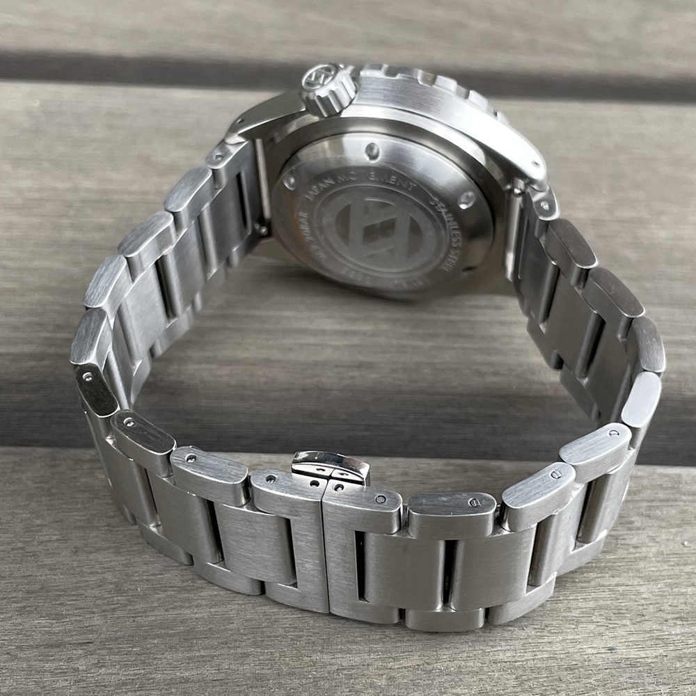 | ■構成パーツ(写真) ・ケース/ケースバック/リューズ:LV1-ver2(パーツのみ非売品) ・風防:FL-DOME1(ARブルーコーティング)※パーツのみ非売品 ・ベゼル:FLB1(ノーマル)※パーツのみ非売品 ・ベゼルインサート:jg-bk ・チャプターリング:crin-orbk ・ダイアル:dl-lv1c1bkm ・針:hd-lva15 ・ムーブメント:SEIKOウォッチ NH36A ■商品スペック ・ムーブメント:自動巻き/セイコー(SII/TIM) NH36A Japan Movement ・ケース:316Lサージカルステンレス/直径約42MM(約45mm リューズを含む) ・リューズサイズ:直径約7.5mm ・ダイアルカラー:ブラック ・ベルト:ラバーベルト/ステンレスベルト(2種付属) ・風防:サファイアクリスタル(無反射/ARブルーコーティング)/ダブルドーム ・ベゼル:316ステンレス ・ベゼルインサート:セラミック ・チャプターリング:ブラス ・重量:約105g(本体のみ、ベルトを含まず) ・蓄光:ルミナスC1(インデックス、針) ・ヘリウムエスケープバルブ ・防水性:20気圧防水 ・製造:日本製、自社(川越市)組み立て ・保証:1年保証 ・付属品:専用BOX、説明書 ・備考:正規品/シリアル番号の指定は出来ません。 |