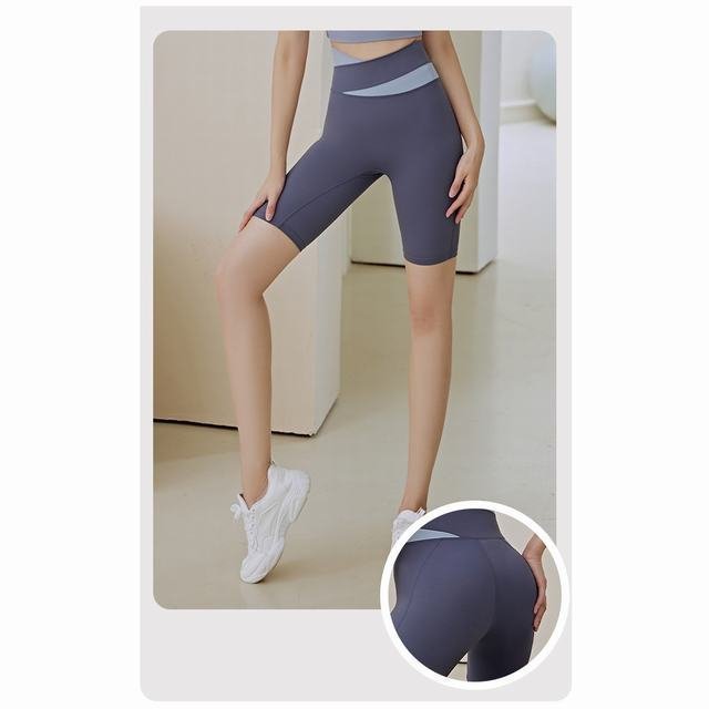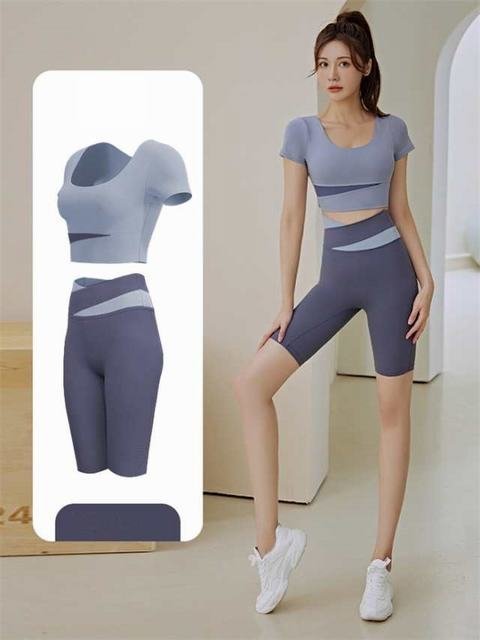 ヨガウェア レディース 上下セット 室内 おうちヨガ 体型カバー Uネック ショート丈トップス カップ付き ブルー サイズL