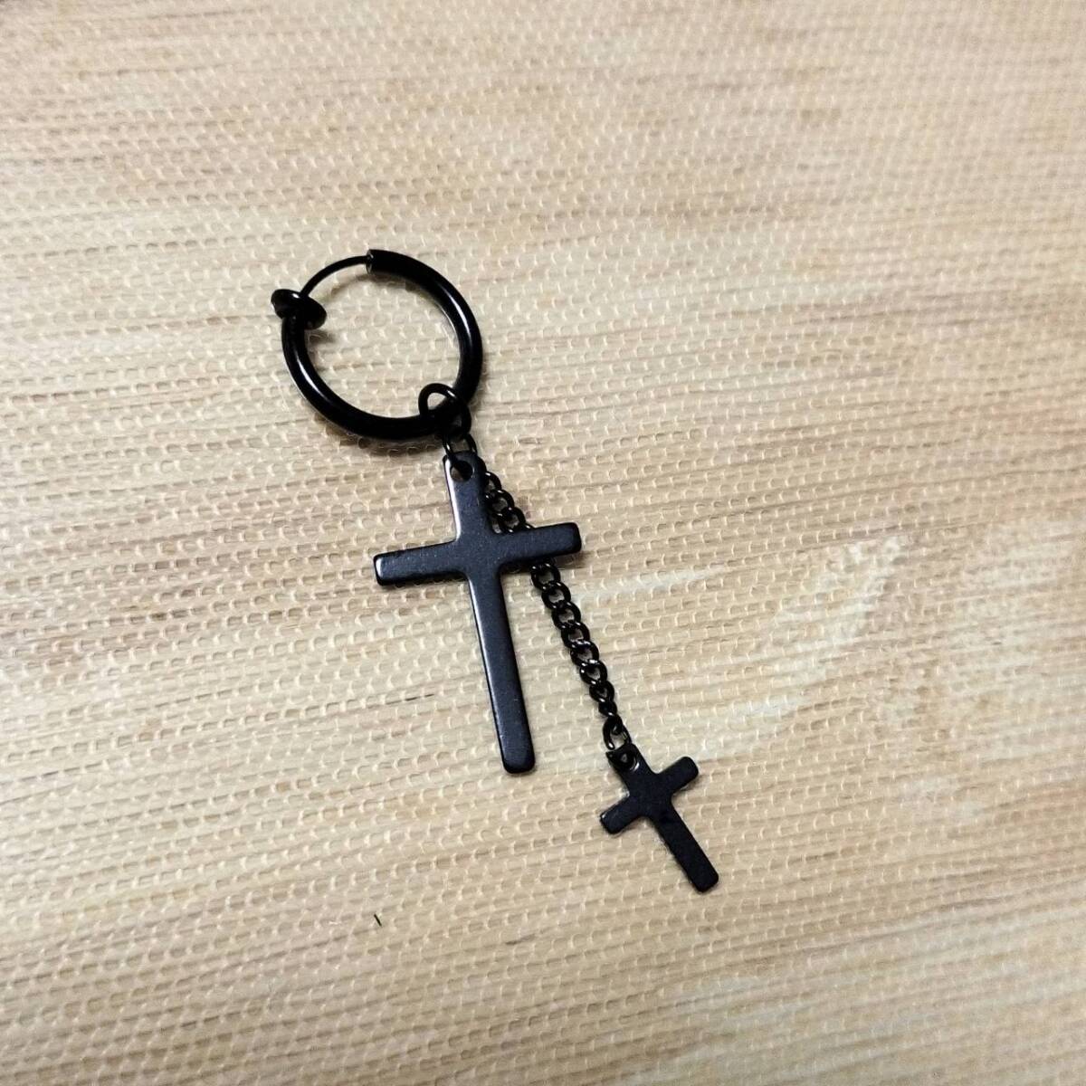 商品説明フェイクピアス イヤリング 片耳 ばね式 ブラック クロス 黒 十字架 ステンレス メンズ レディース ユニセックス パンク ロック ヒップホップ 1ピース 穴無し シンプル バックル ロジウム ペンダント スプリング