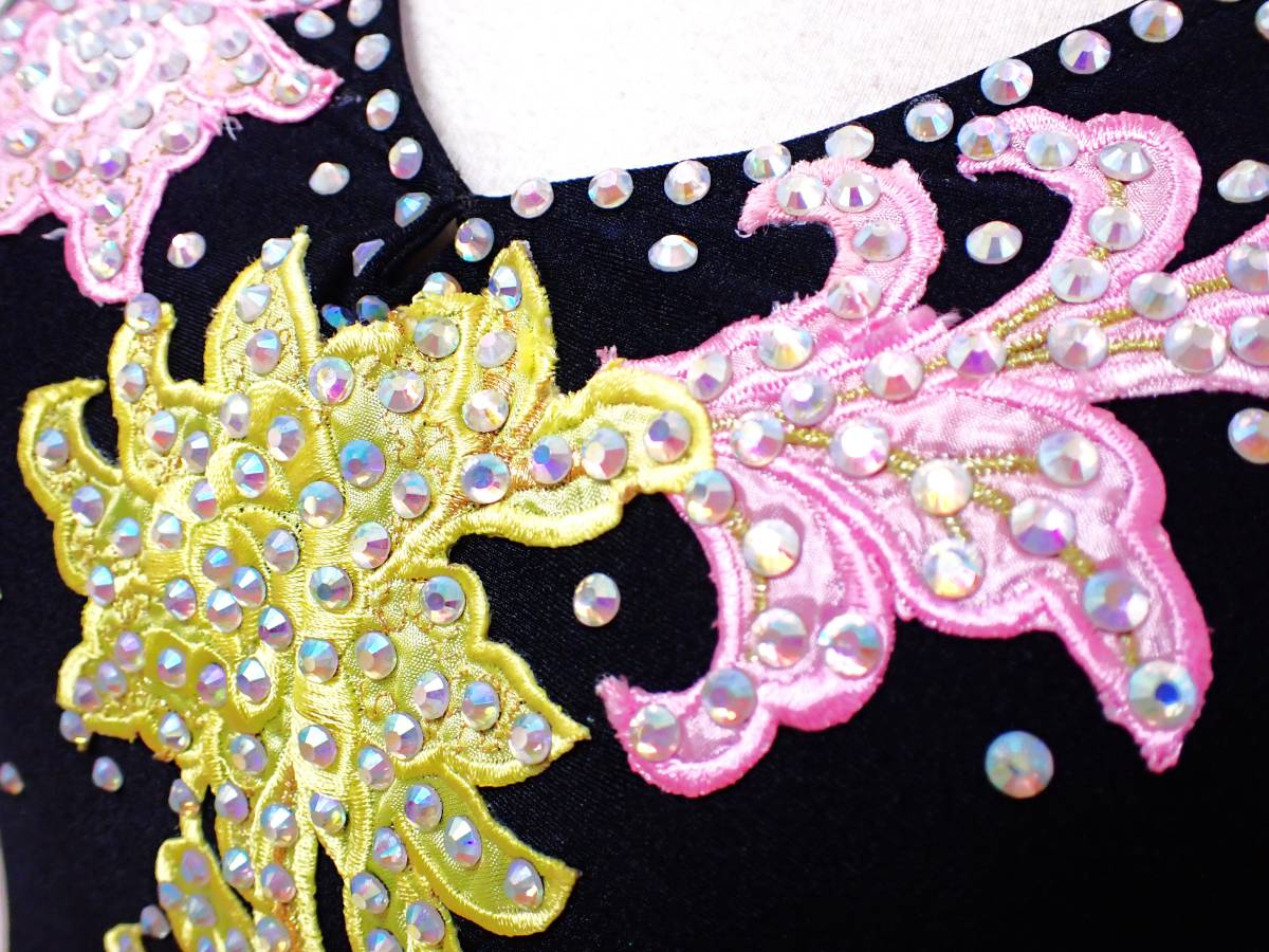 ③24A12即決★Mサイズ★ピンク×オレンジ×黄色/サテン/黒/ワンピース/ラテンドレス☆社交ダンス/ラテン/パーティー