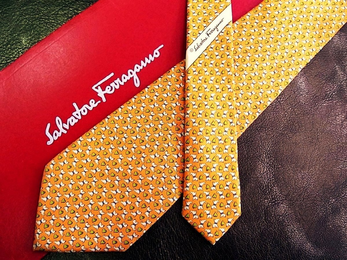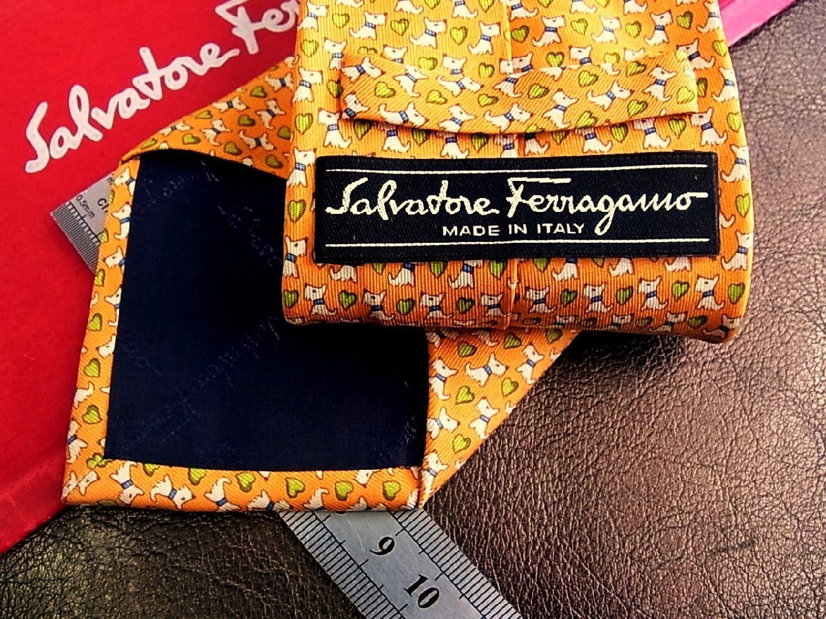 ★並品★4R01629【Ferragamo】フェラガモ「犬 いぬ 動物 ハート 柄」ネクタイ