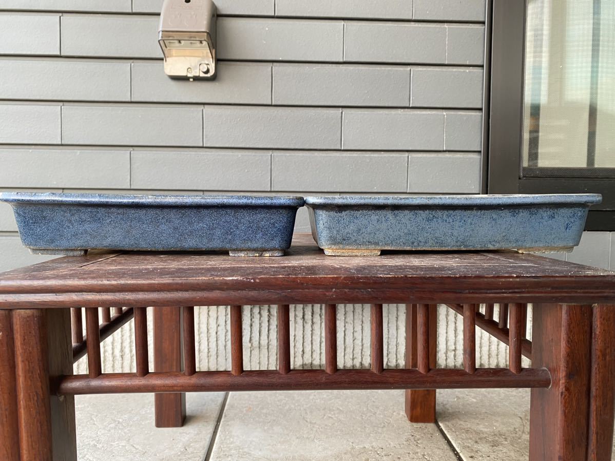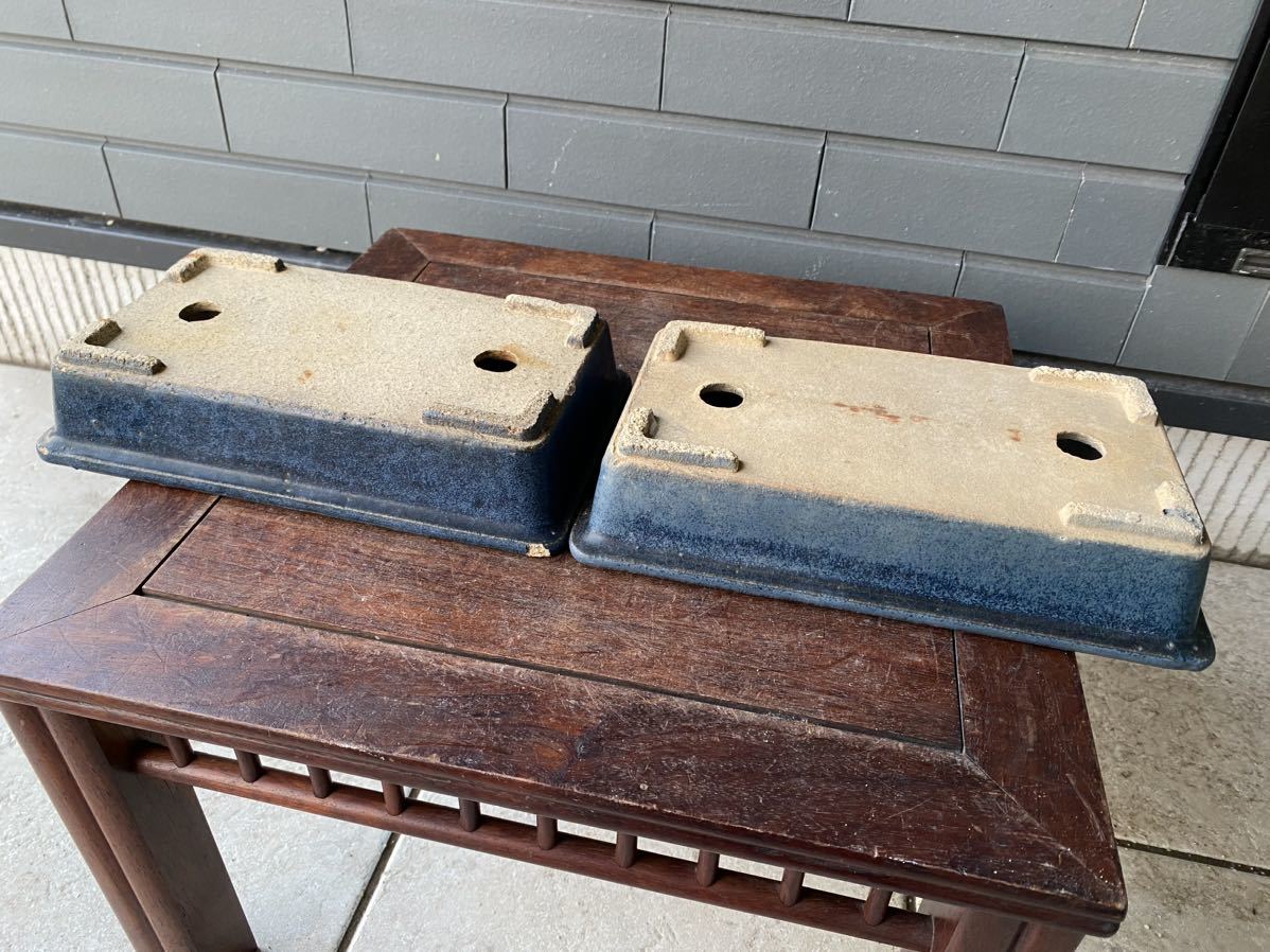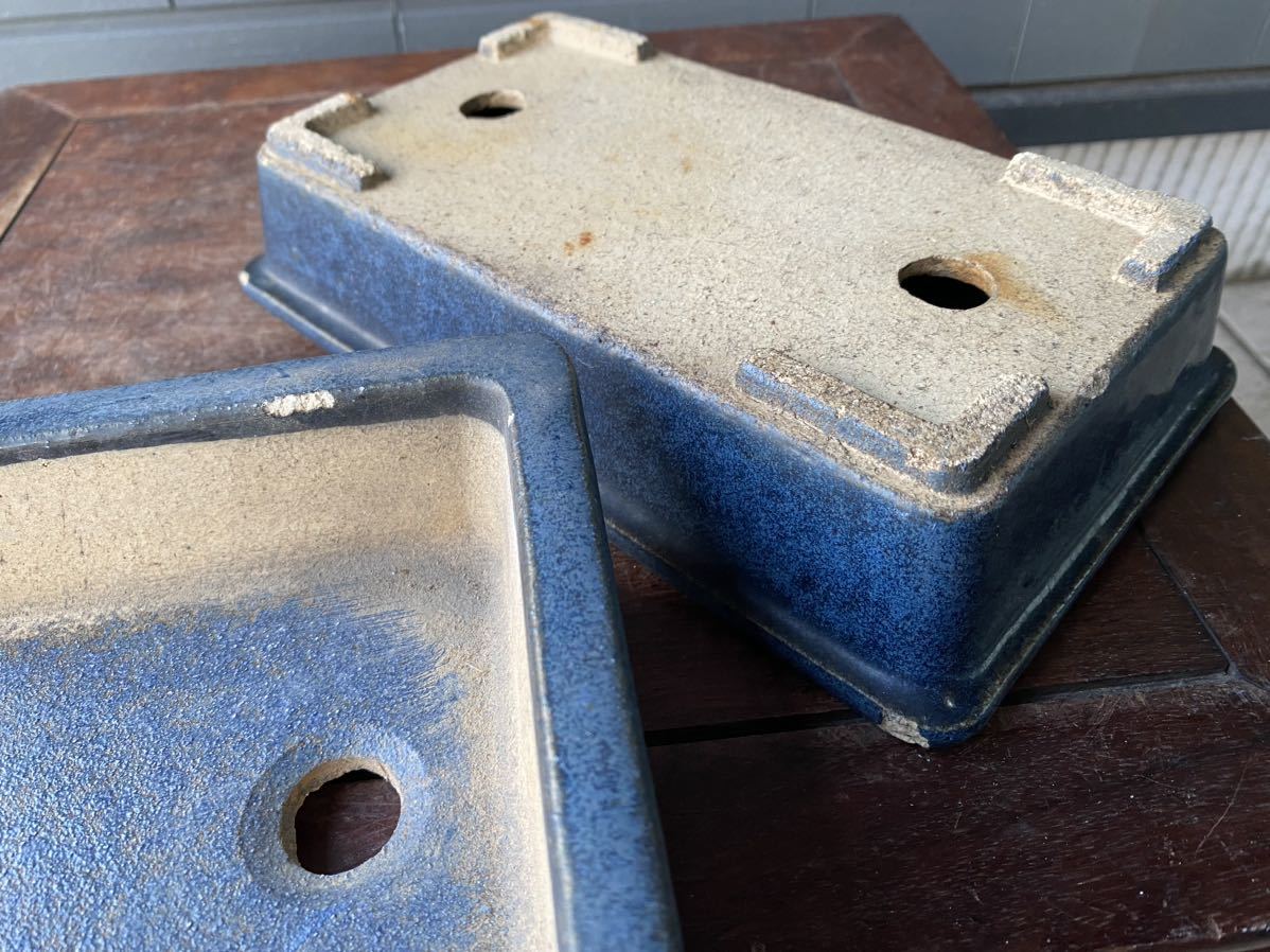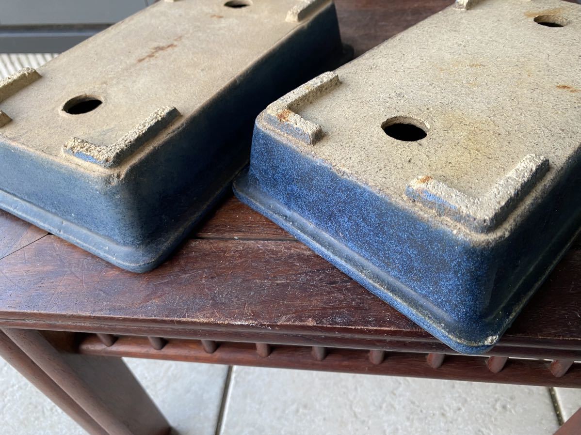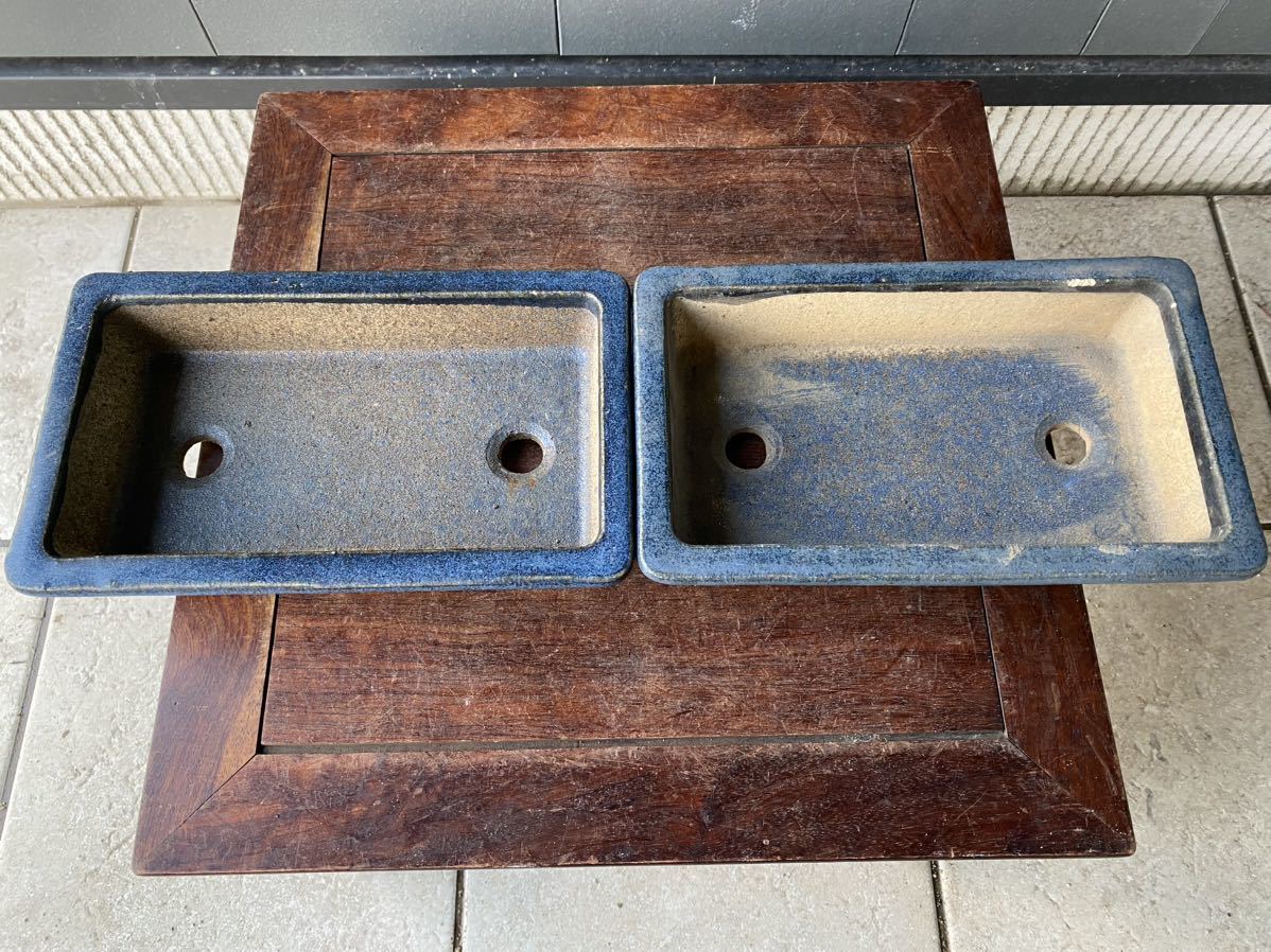 長方で青色の盆栽鉢2点セットです。
