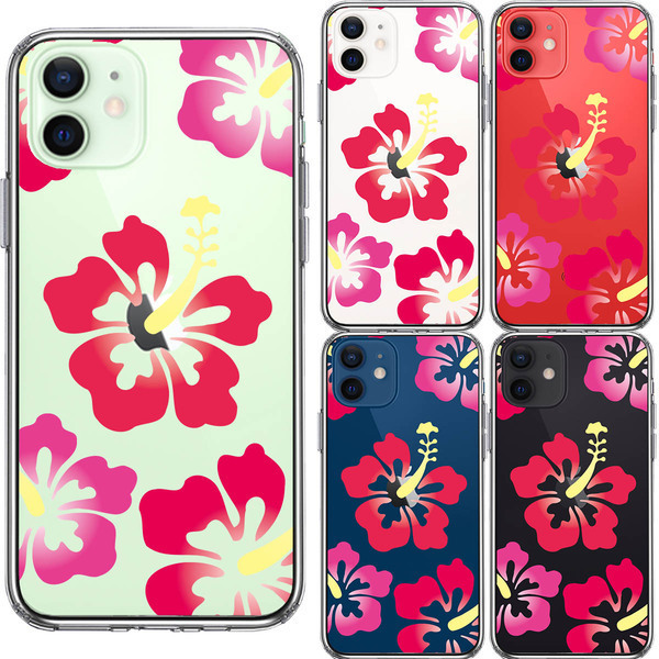 iPhone12mini ケース クリア ハイビスカス レッド スマホケース 側面ソフト 背面ハード ハイブリッド
