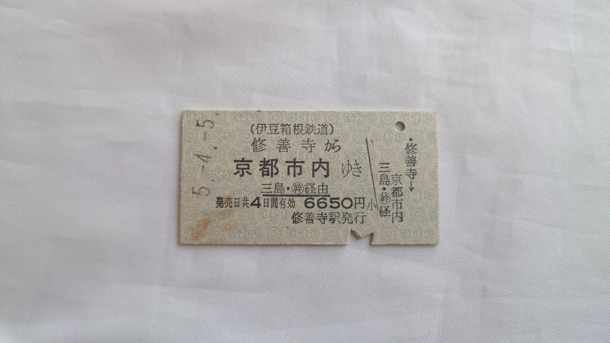 ▲伊豆箱根鉄道▲修善寺から三島新幹線経由京都市内ゆき乗車券▲A型硬券平成5年