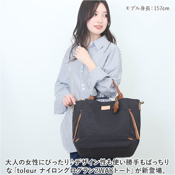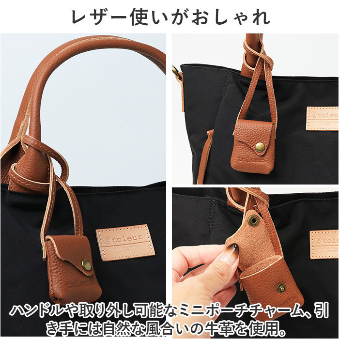 商品説明 | ・・大人の女性にぴったり♪デザイン性も使い勝手もばっちりな「toleur ナイロングログラン2WAYトート」が新登場。 ・【レザー使いがおしゃれ】 ・ハンドルや取り外し可能なミニポーチチャーム、引き手には自然な風合いの牛革を使用。カジュアルな中に、上品さをプラス。 ・【収納力があり、使い勝手ばっちり】 ・お出かけに必要な小物がすっきり収まるサイズ感。底に芯地を入れることで形崩れを防ぎ、ちょこっと荷物が重くなっても安心。 ・【持ち方を選べる2wayタイプ】 ・手持ちではもちろん!長さ調節可能なショルダーベルトを取り付けて、斜め掛けや肩掛けも。シーンやお好みに合わせてスタイルチェンジ。 ・【マグネットでワンタッチ開閉】 ・開口部はマグネット式で、簡単オープン!中身の飛び出しもガード。 ・【うれしいA4対応サイズ】 ・内側はA4サイズのファイルが、横向きにすっぽり。マチもあり、ペットボトルやコスメポーチ、お弁当箱なども収納可能。 ・【サッと取り出せるポケット】 ・内側と外側に合わせて5つのポケットを配置しており、小物が迷子になりにくい!正面からはポケットが見えないという”さりげなさ”もポイント。 ・【シーンを選ばず活躍】 ・お出かけや通勤、旅行などでも重宝。ちょっとおしゃれなマザーズバッグとしてもおすすめ。 ・【お気に入りをチョイス】 ・コーデに取り入れやすい、落ち着きのあるカラーをラインナップ。不織布素材の収納袋付き。 ・【toleur-トーラ-】 ・沢山の人にレザーを使ったバッグを持ってもらいたいという願いを込め、フランス語をもとに名づけたブランド。レザーを使い、ナチュラル感と使いやすさを兼ね備えた仕上がり。 ・【ポケット仕様】 ・内側:ファスナーポケット×1、オープンポケット×2 ・前面:ファスナーポケット×2 |