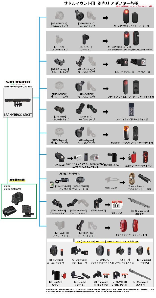 GoPro HEROシリーズのカメラ または ゴープロインターフェイスのある互換性があるカメラや、GPの型番で始まるセーフティライトアダプター・テール系アダプター(泥除け/ゼッケンなど)・カメラアダプター・ライトアダプター・サイクルコンピューターアダプターなどが取付可能