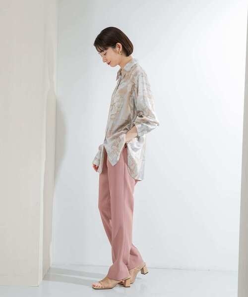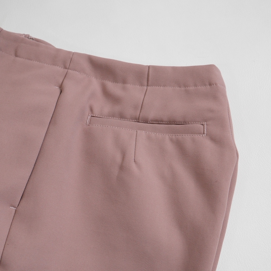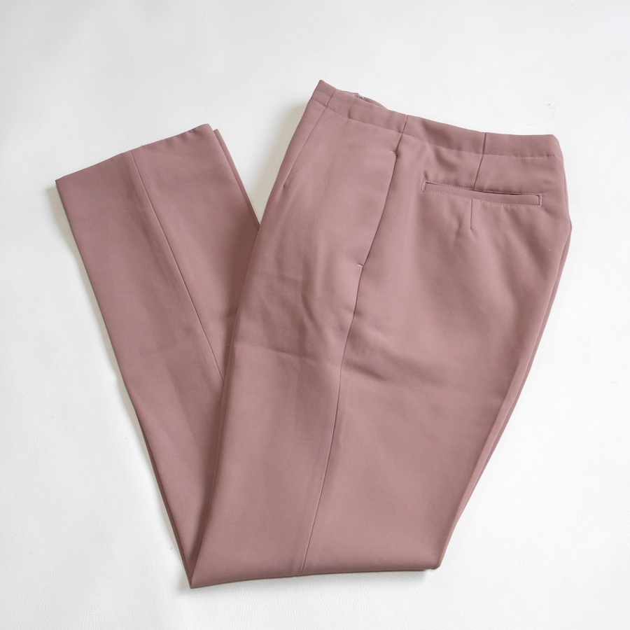 身体のラインを拾いすぎないようにハリのある生地を使用したテーパードパンツ。 ヒップにもたつきが出ないよう、スッキリとしたラインに仕上げました。 ベルトループを省いたウエストデザインも相まって脚長効果も期待できる優秀パンツです。