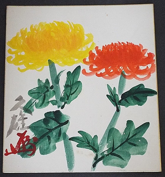6482☆☆真作・肉筆色紙・小平久雄・菊画・政治家・裏面にも署名有☆