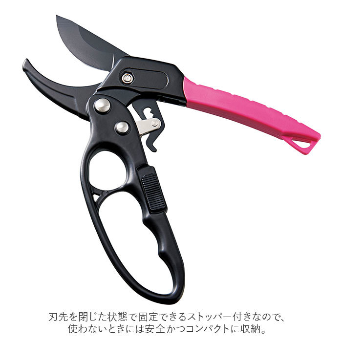 | 注意点 | ※※本品は枝木専用です。プラスチック、金属類の切断には使用しないでください。 ※使用しない時は必ずストッパーをし、お子さまの手の届かない所に保管してください。 ※お取り扱いの際は、商品やパッケージなどに記載されている品質表示、アテンションタグ、ご使用上の注意事項などを必ずご確認下さい。 ※本来の目的以外にはご使用にならないで下さい。 ※カメラやモニターの性質により、画像と実物の色の違いがある場合がございますのでご理解願います。 |