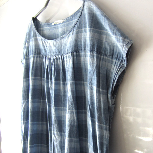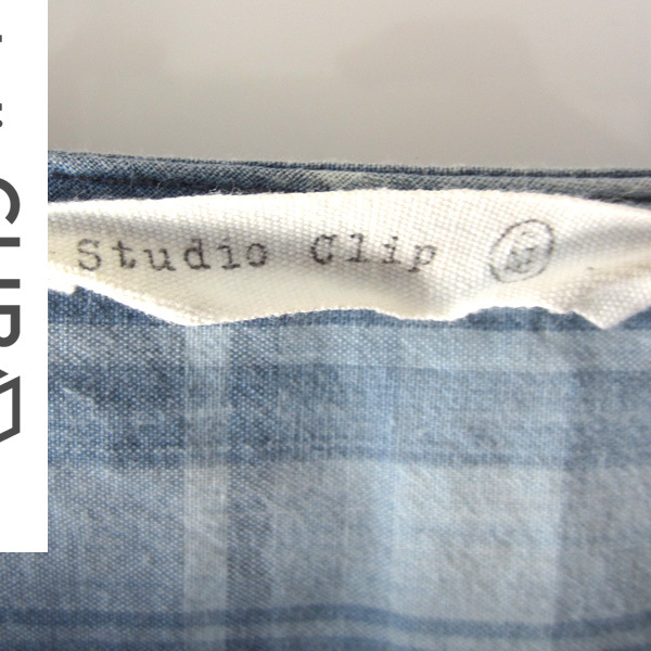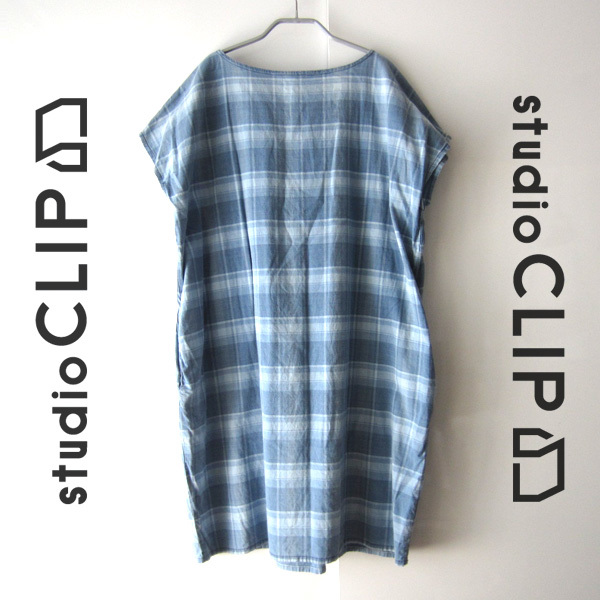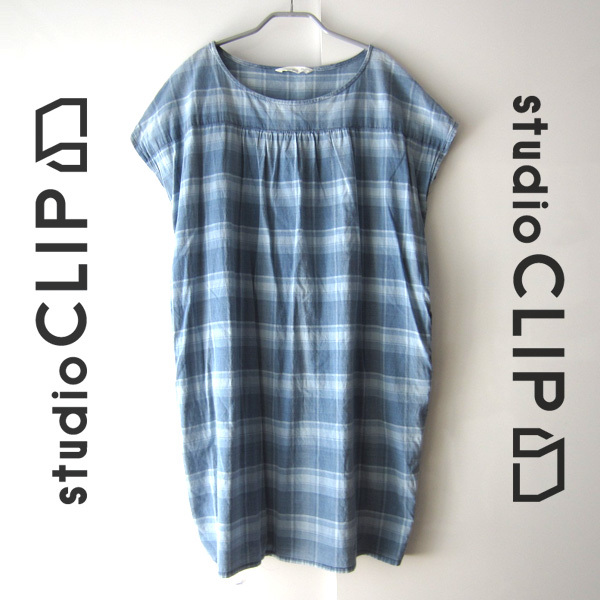 美品 studio CLIP/スタディオクリップ★ チェック インディゴ染め 膝丈ワンピース