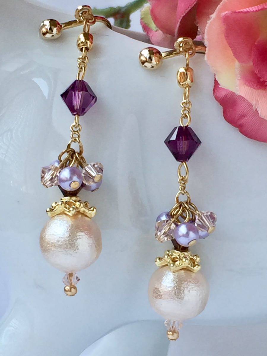 コットンパール・スワロフスキーエレメント・チェコビーズ・メタルパーツを使用したイヤリングです。