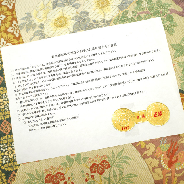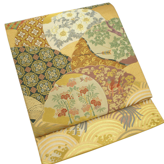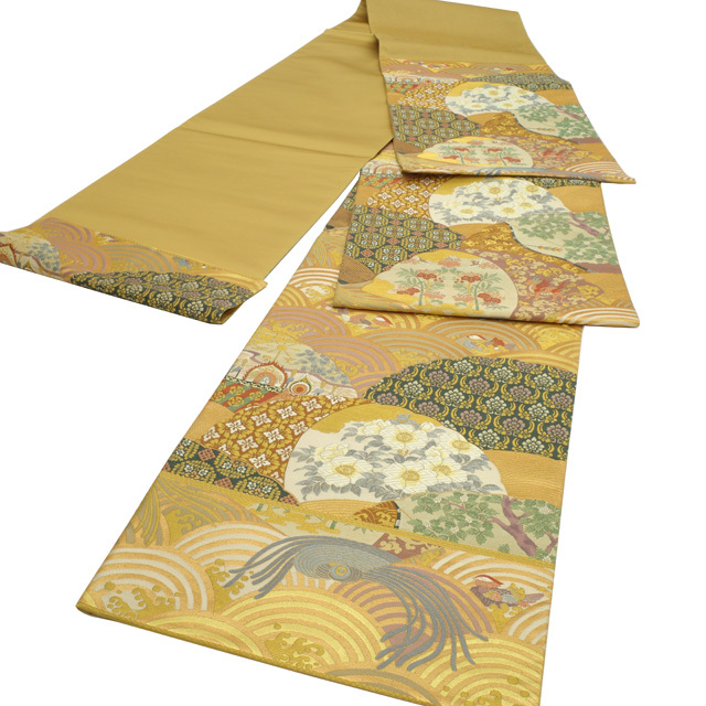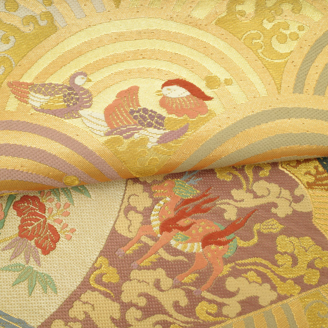 【中古】 すごい値! 袋帯 リサイクル フォーマル 京都 西陣 正絹 京藝 金色地 桐 華文 青海波 鴛鴦 麒麟 花 弓矢 金糸 六通柄 仕立て上がり 春 秋 冬 豪華 結婚式 お茶会 七五三 入学式 卒業式 など 販売 購入 綺麗 美品 たとう紙付き 送料無料 20代 30代 40代 50代 60代 70代 80代 リユース すごいね みやがわ neb00872