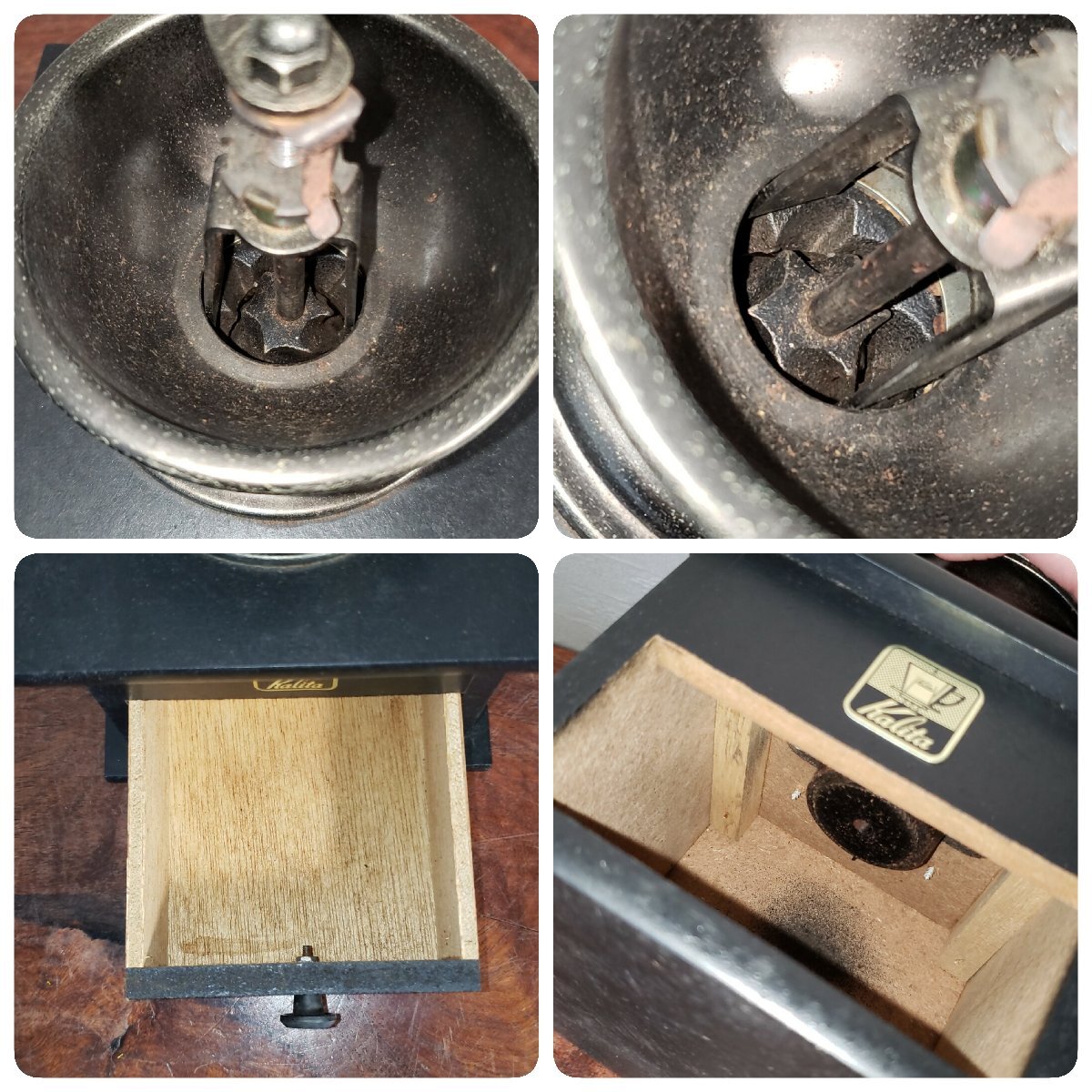 カリタのコーヒーミルです。金属部分に錆があります。内部など細かい部分は現状のままとなっています。大まかに取りましたが豆の屑が残っています。経年による汚れ、擦れがあります。動作は確認していません。