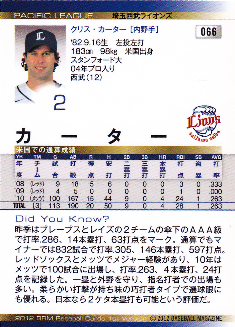 2012BBMベースボールカード1st 066 クリス・カーター 埼玉西武ライオンズ
