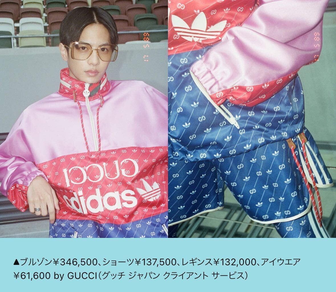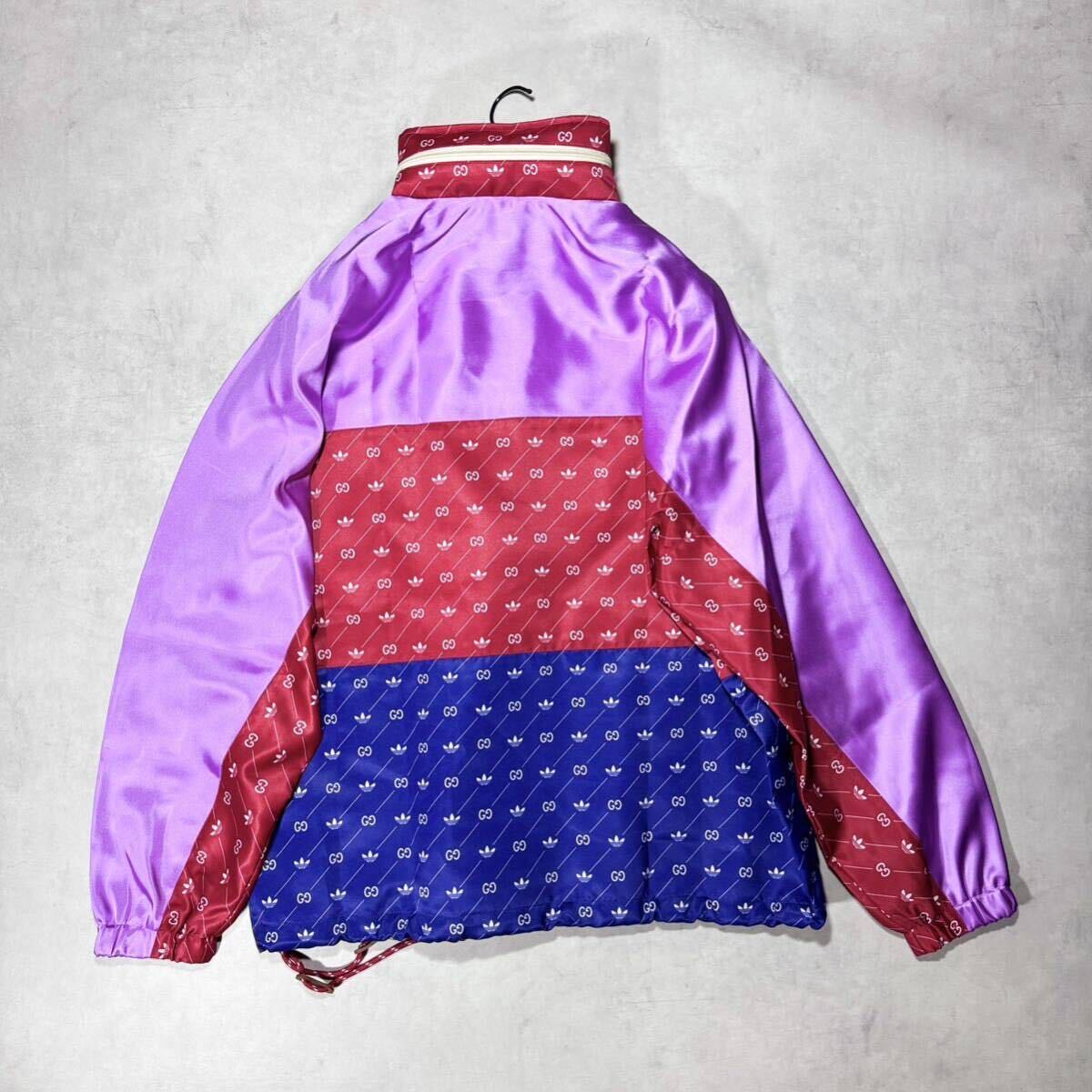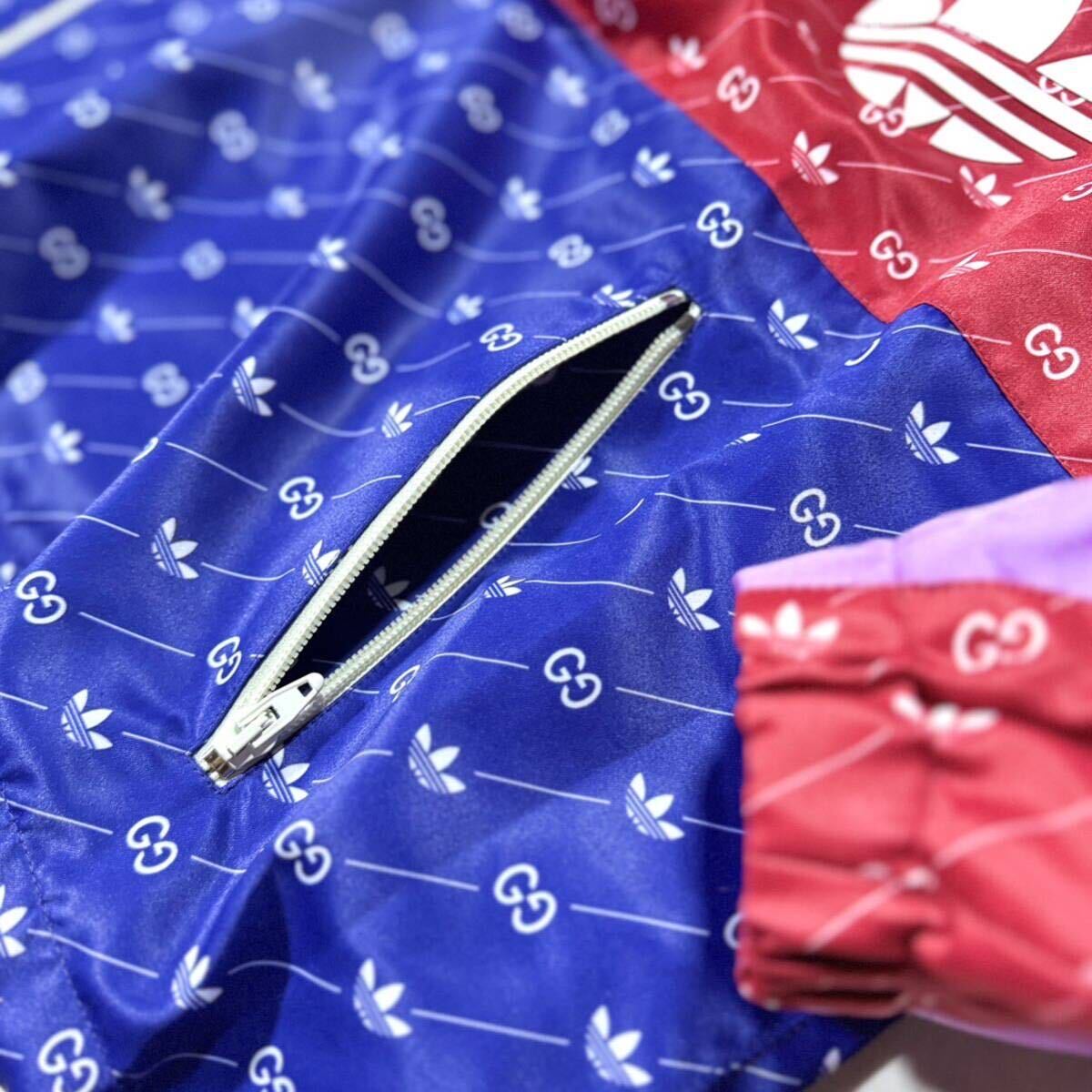 ピンク、レッド、ダークブルーという鮮やかなカラーブロッキングと、フロントに配したグッチの左右反転ロゴ&アディダスのロゴ、そして、それぞれのアイコンを融合したスペシャルなプリントで彩ったプルオーバージャケットとなっています。