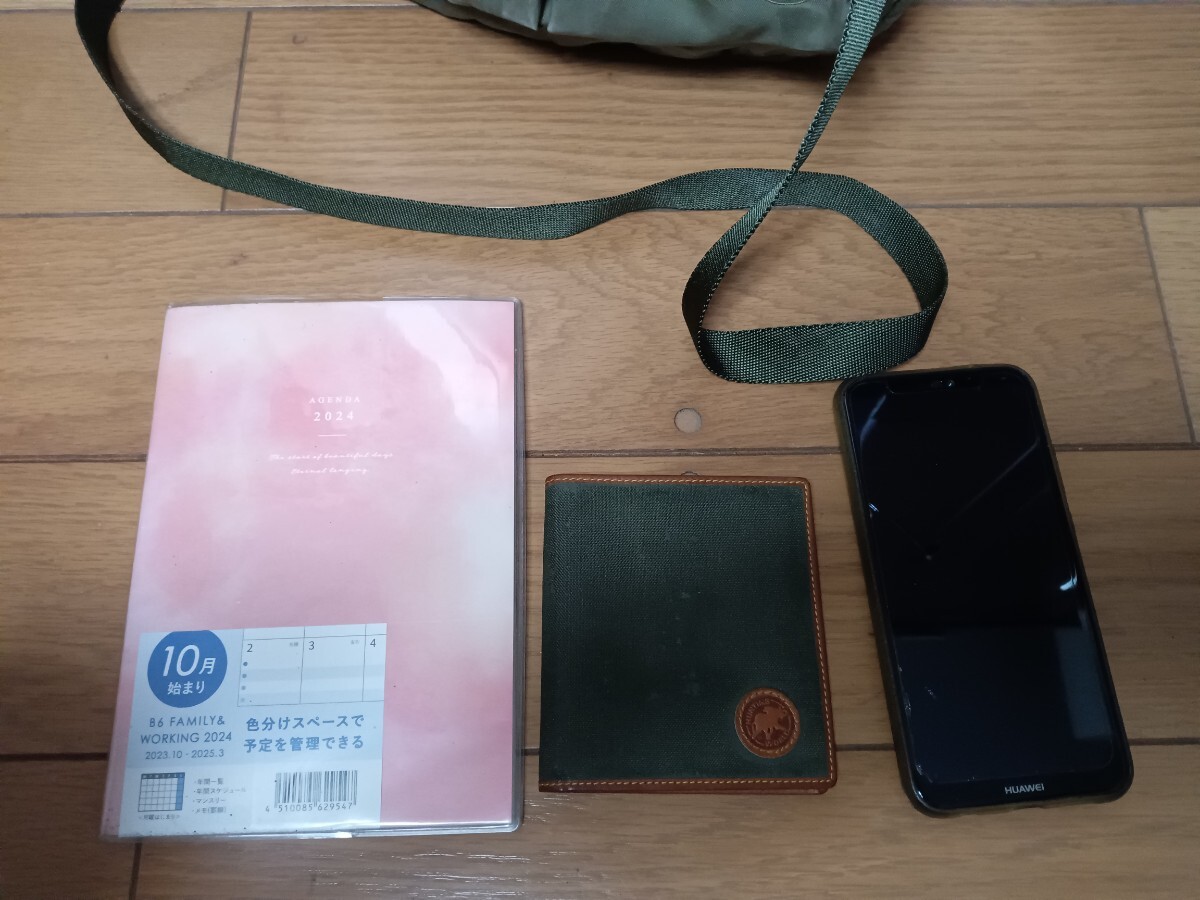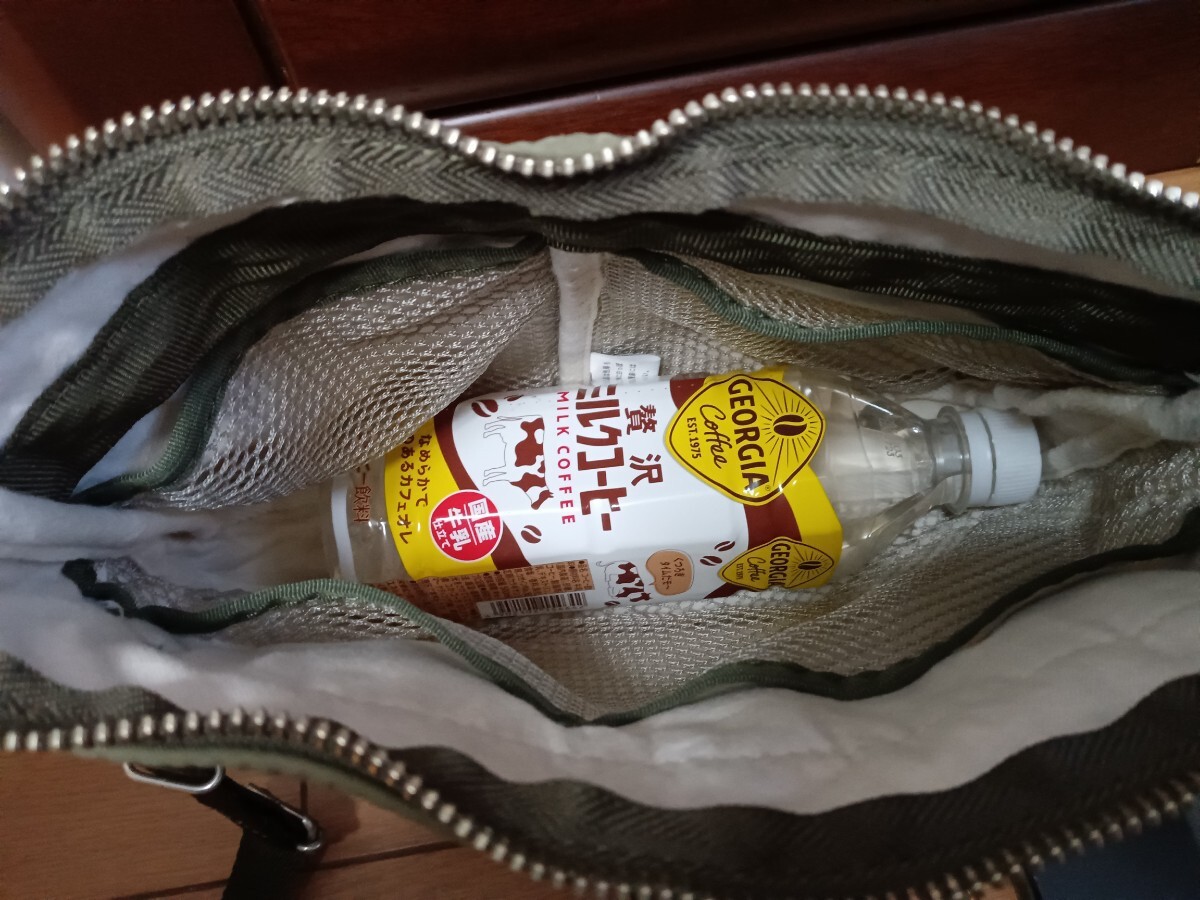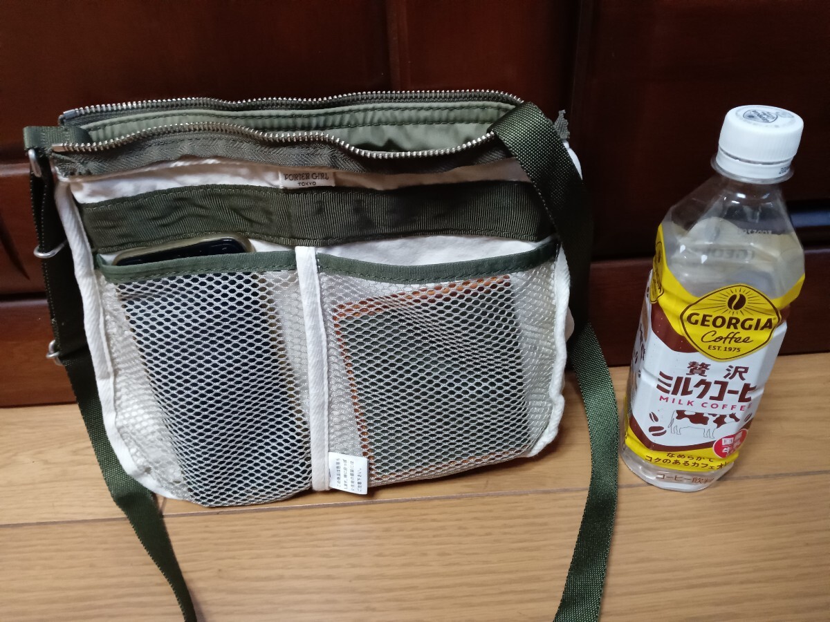 スマホ、長財布、のほか、大きめの手帳、500ペットやタオルまで入るサイズ。