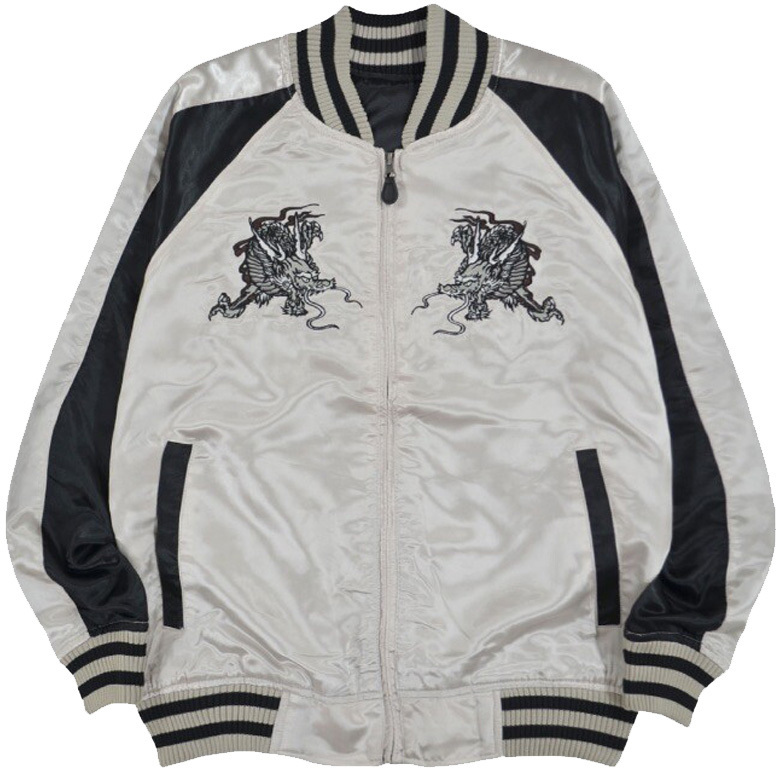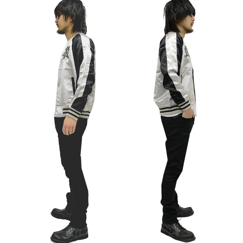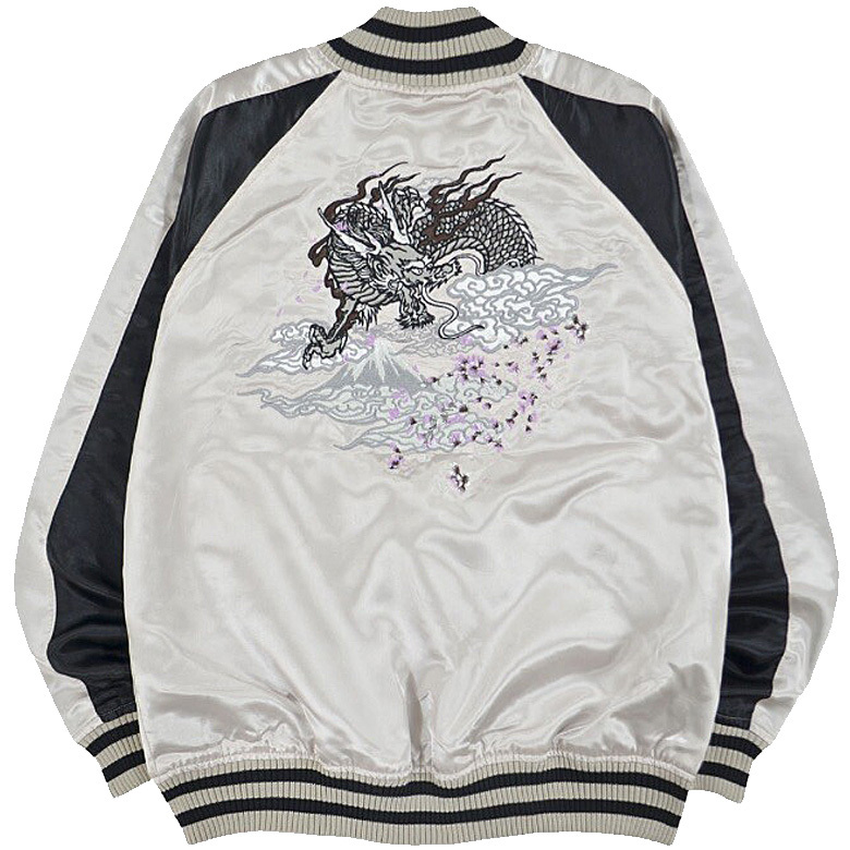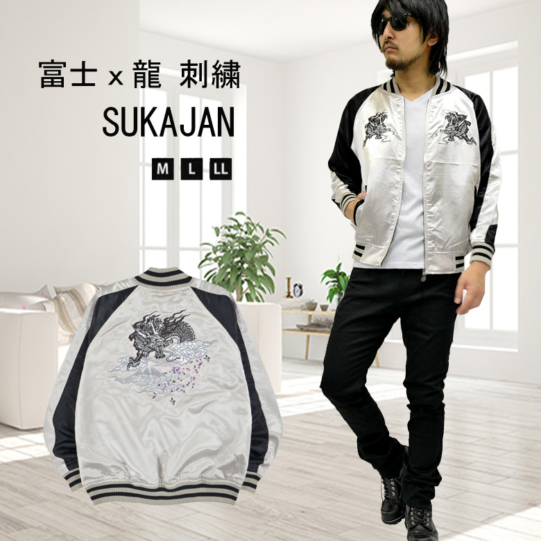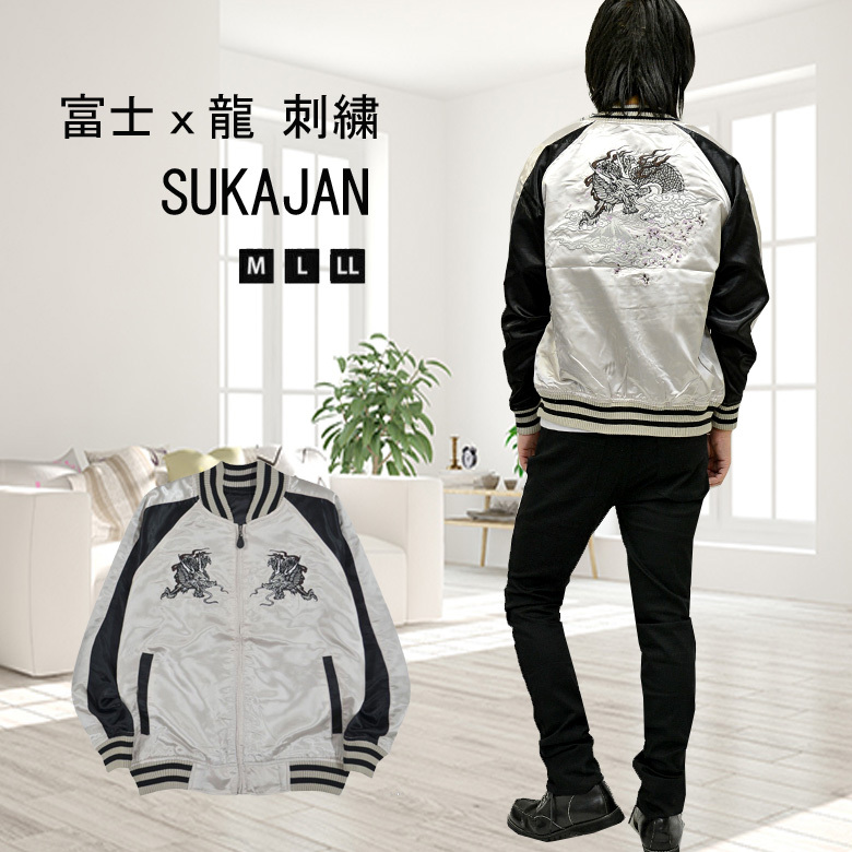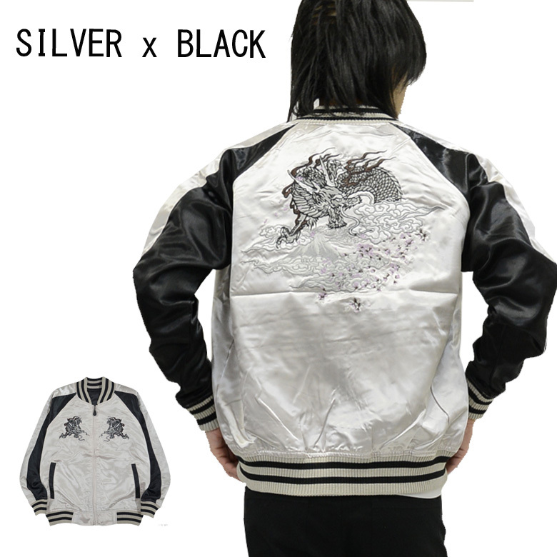 龍x富士 和柄刺繍 サテン スカジャン 本格 和柄刺繍 スカジャン 735-3281z JAPAN 新品 ブラックxシルバー L