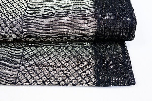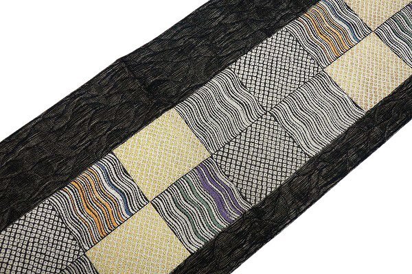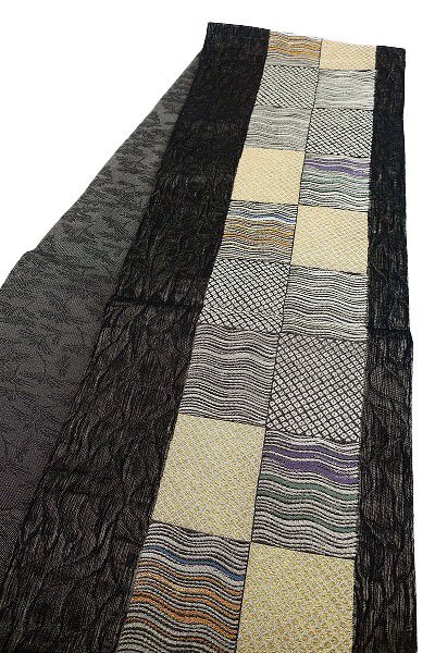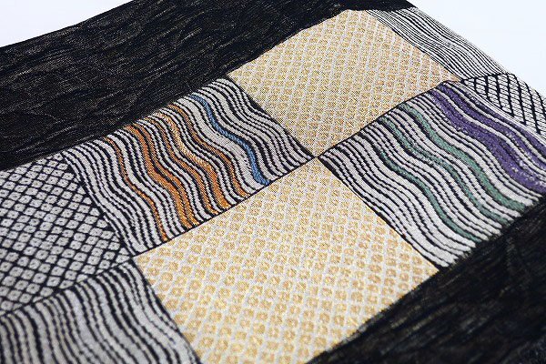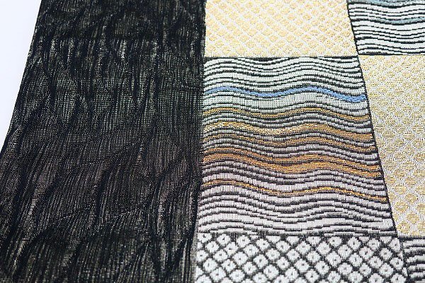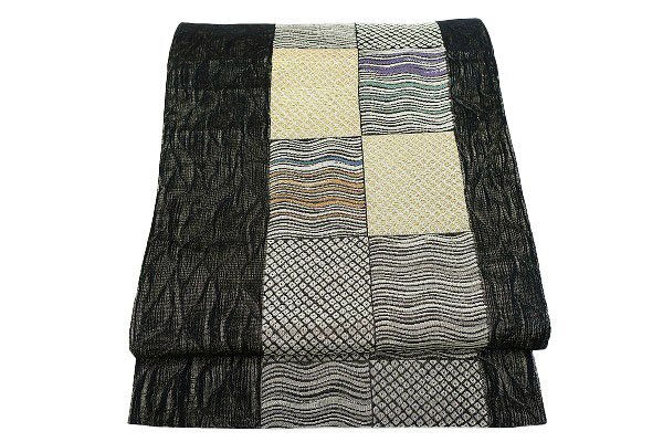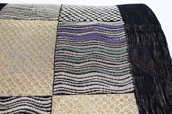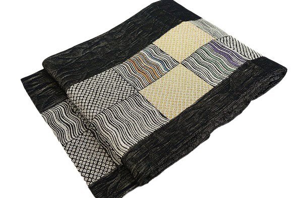 市松に鹿の子や波模様が織り込まれた袋帯です。 金糸や銀糸が上品に煌めく一本です。 春、夏、秋の3シーズンご着用いただけます。 未使用品です。 |