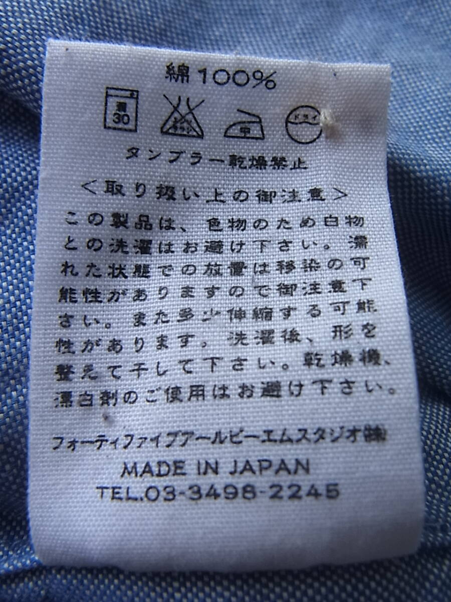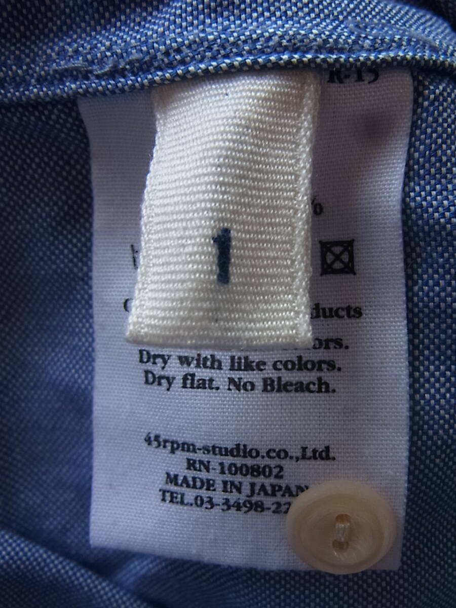 45rpm umii908 フォーティーファイブ ウミキューマルハチ コットンオックス素材 インディゴシャンブレー素材 シャツ サイズ 1 日本製