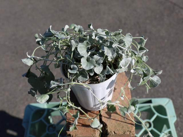 ディコンドラ/シルバーフォールはやさしい雰囲気の丸葉にシルバーの輝きが上品な植物です。日差しに強く加湿になると葉が黒くなりとろけるので注意です。伸びて垂れるのでハンキングバスケットにも良いでしょう。