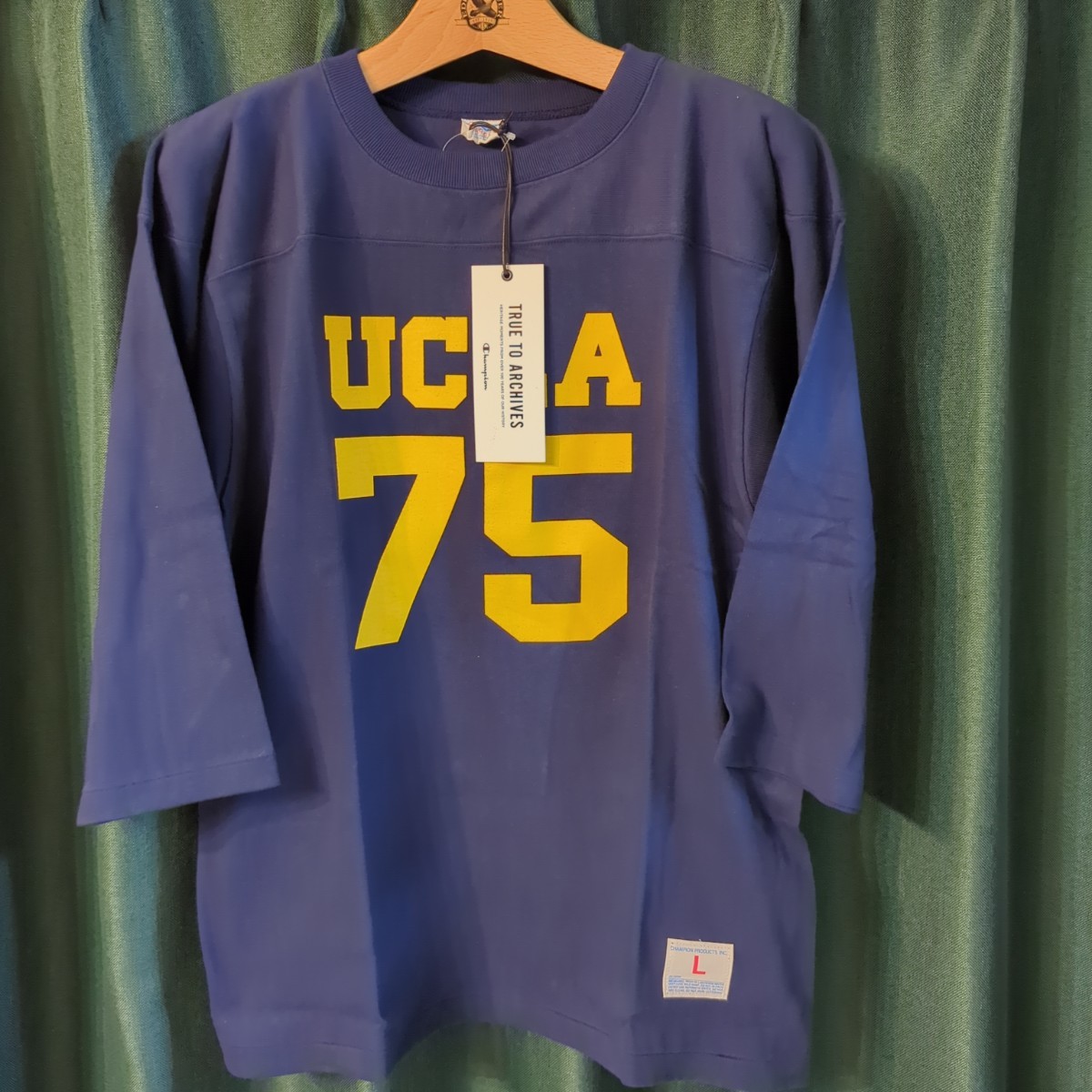 1970年代 復刻 チャンピオン バータグ true to archives UCLA 3/4 七分袖 フットボール Tシャツです。