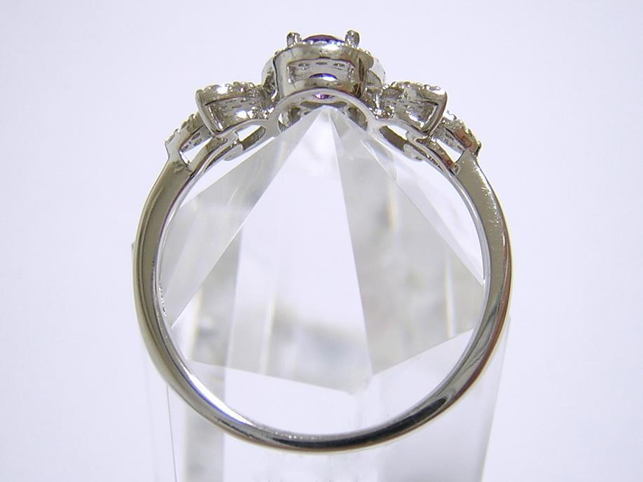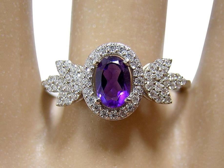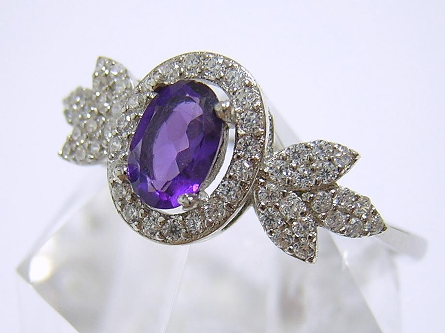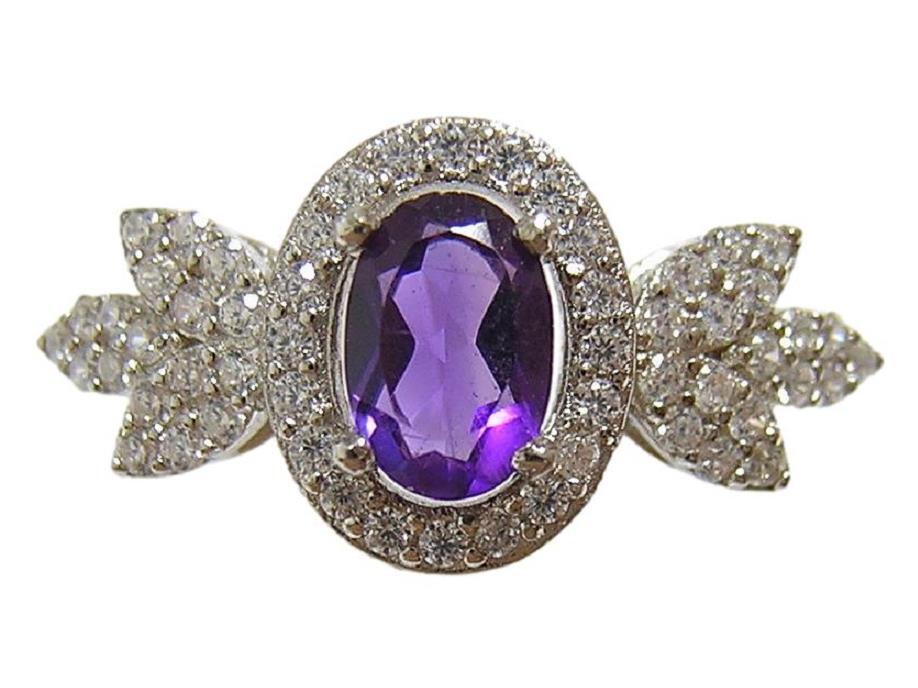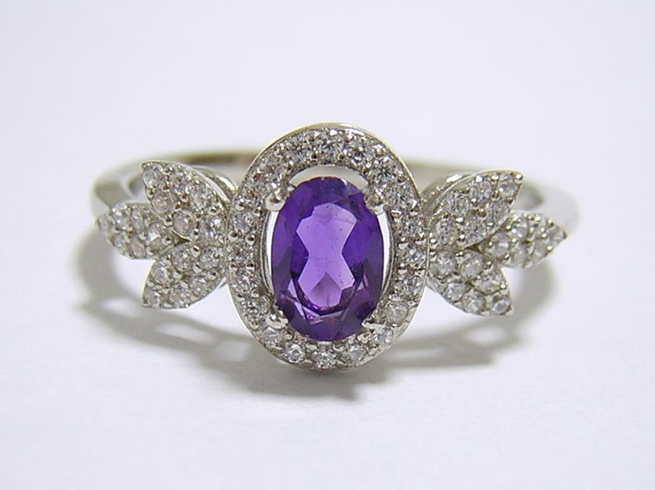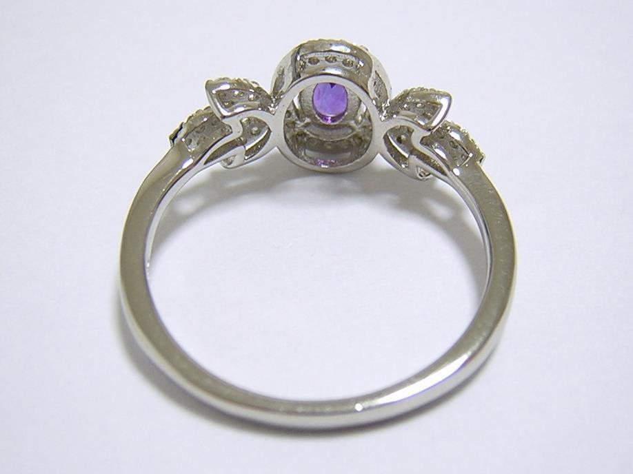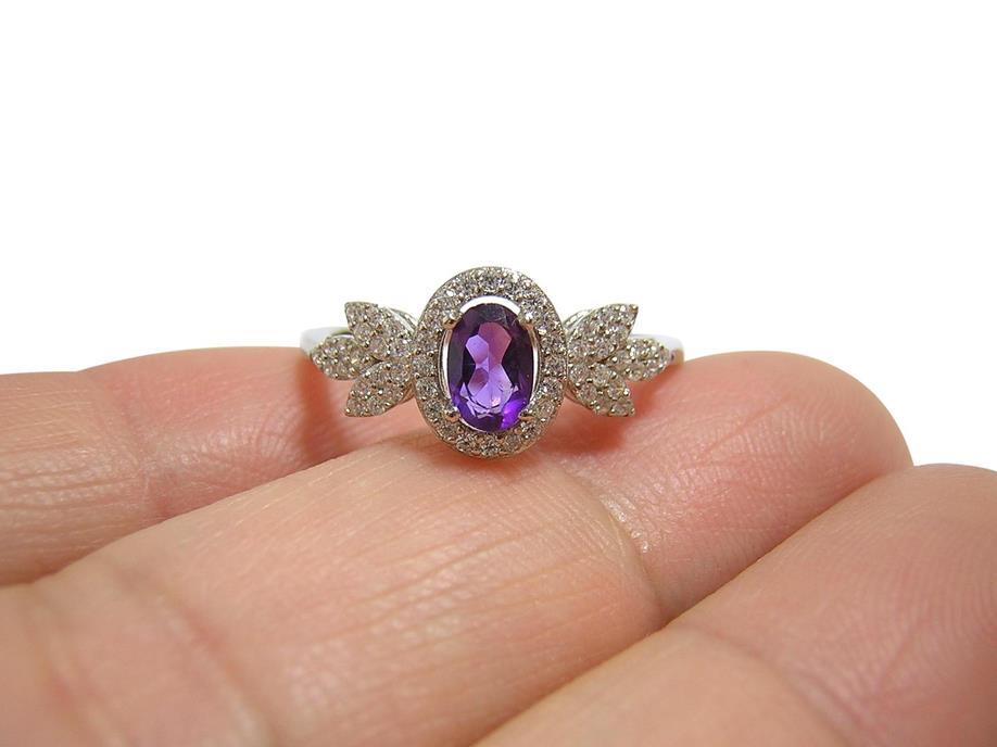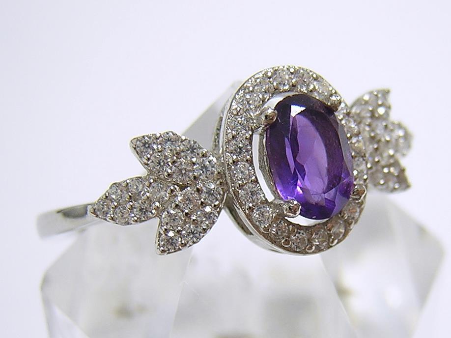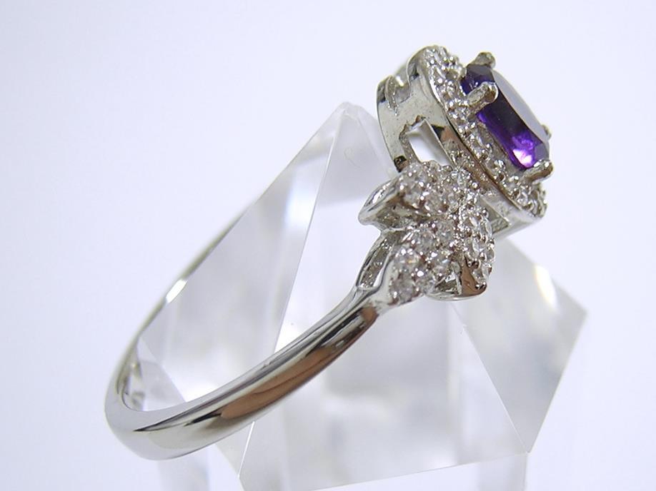 天然アメジストとキュービックジルコニアを使用したデザインリングです。 アメジストの大きさは約6×4.5mmで、肉眼では気になりませんがガードル部分にいくつか極小のカケがあります。 【中石】天然アメジスト 【産地】ウルグアイ産 【処理】非加熱 【カット】オーバルファセットカット 【脇石】キュービックジルコニア 【重さ】2.5g 【サイズ】18.75号 (お直しは承れません) デザイン部:縦9mm×横21mm 【素材】シルバー925 (14金ホワイトゴールド仕上げ) 【刻印】925 【状態】新品 ※地金部分に製作時からの微細な小傷やスレがあります。 |