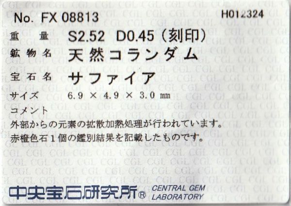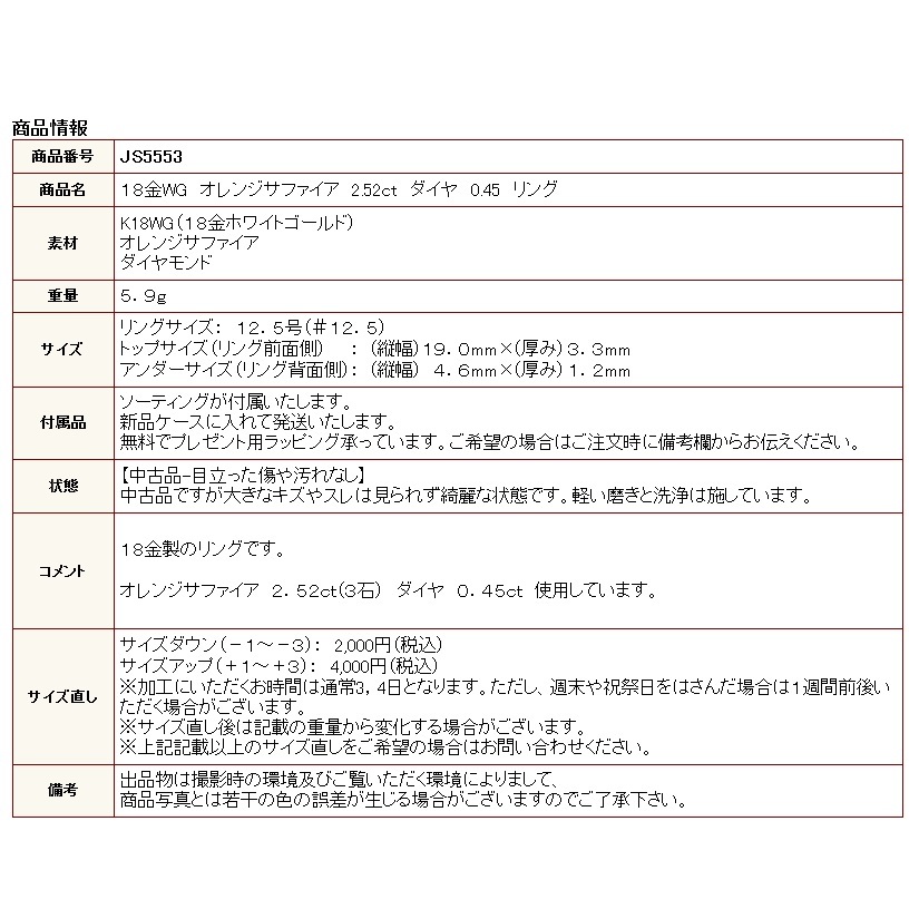 | 商品名 | 18金WG オレンジサファイア 2.52ct ダイヤ 0.45 リング |
