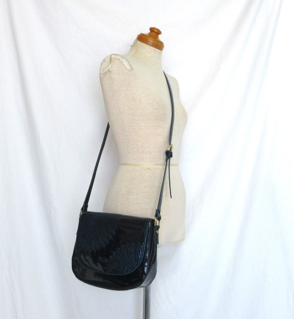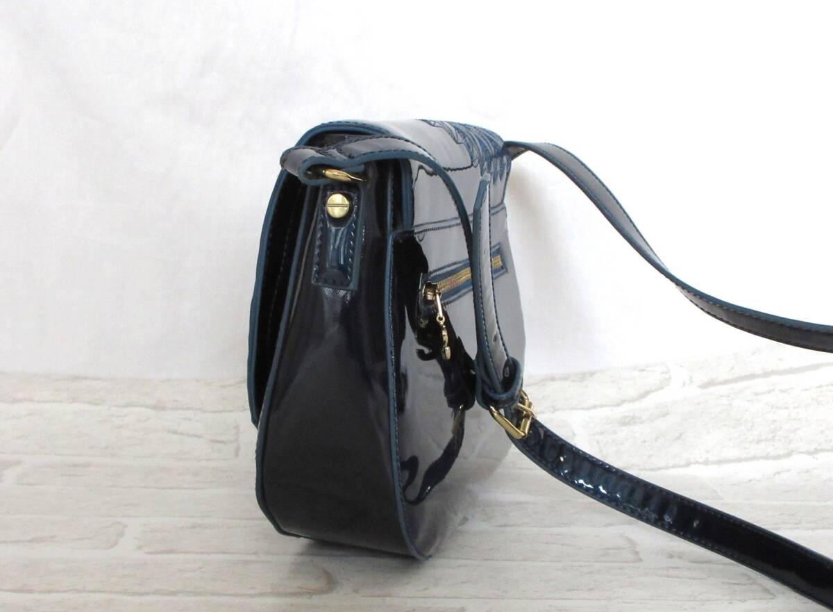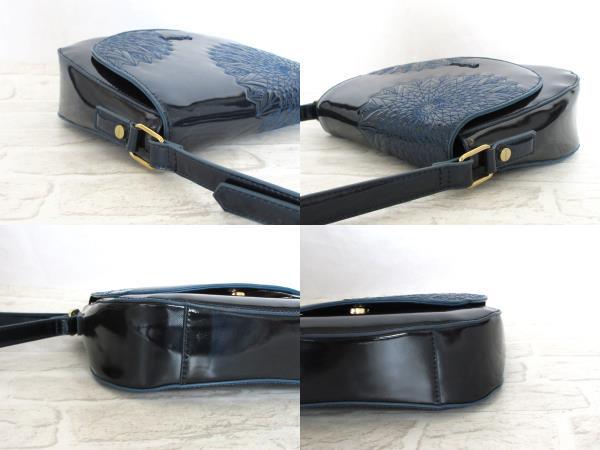 | エナメル特有のつややかなネイビーに刺繍がアクセントになる素敵なバッグです。 | ||