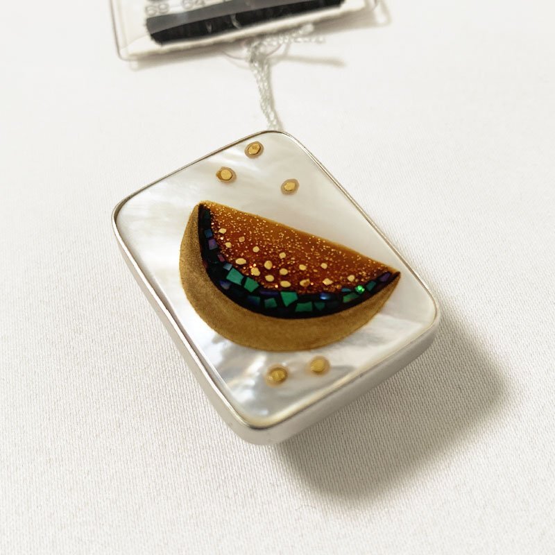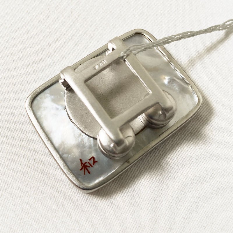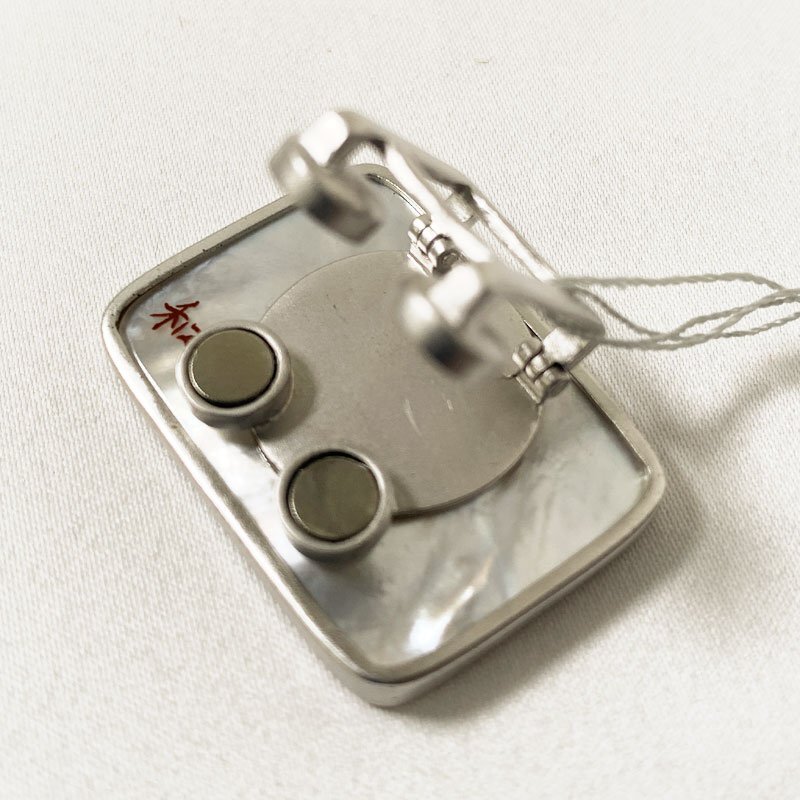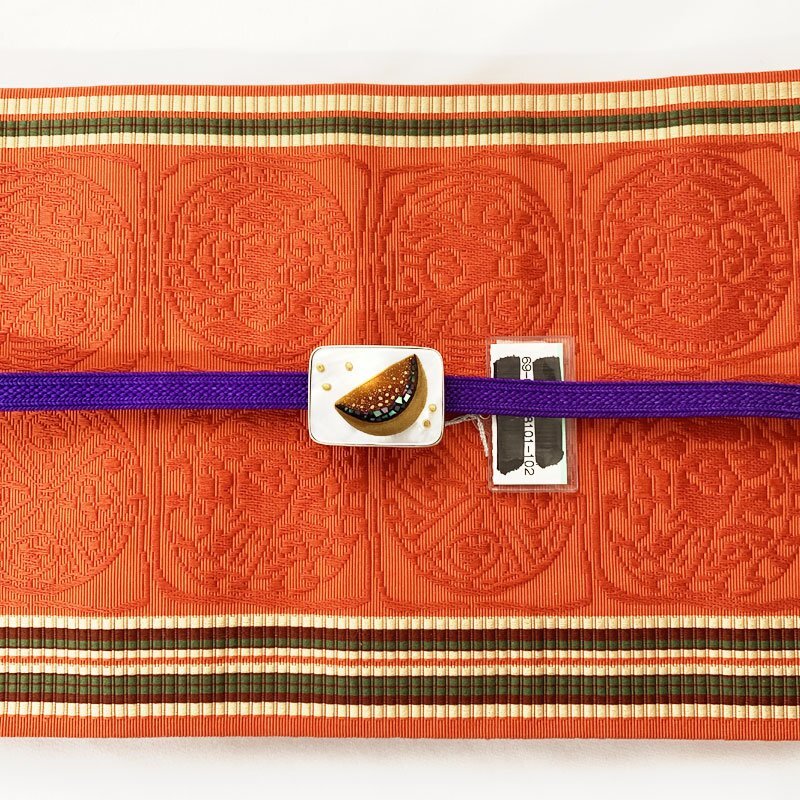 ◆きものやまと 作家物 「和」帯留め SILVER 西瓜?◆美品 (No.gd) 西瓜でしょうか、櫛でしょうか、シルバーの金具に白い螺鈿台に、螺鈿細工や金彩で西瓜のような可愛らしい柄が形作られた帯留です。作家物で「和」の刻印がございます。画像のきものやまとさんのケース付き、上代46,000円のタグ付き 帯締めを通す部分はマグネット式でパカッと開いて挟むようになっています。なお、未使用品で特筆すべきダメージもなく美品です。 【素材】シルバー 【色】白に金、深い青緑など *モニターによって色味は実際と異なる場合がございます。 【サイズ】幅約3cm、縦2.3cm程度、重さ15.6g *素人採寸のため、多少の誤差はご容赦ください。 遊び心を感じさせる可愛らしい逸品ですのでいかがでしょうか。 |