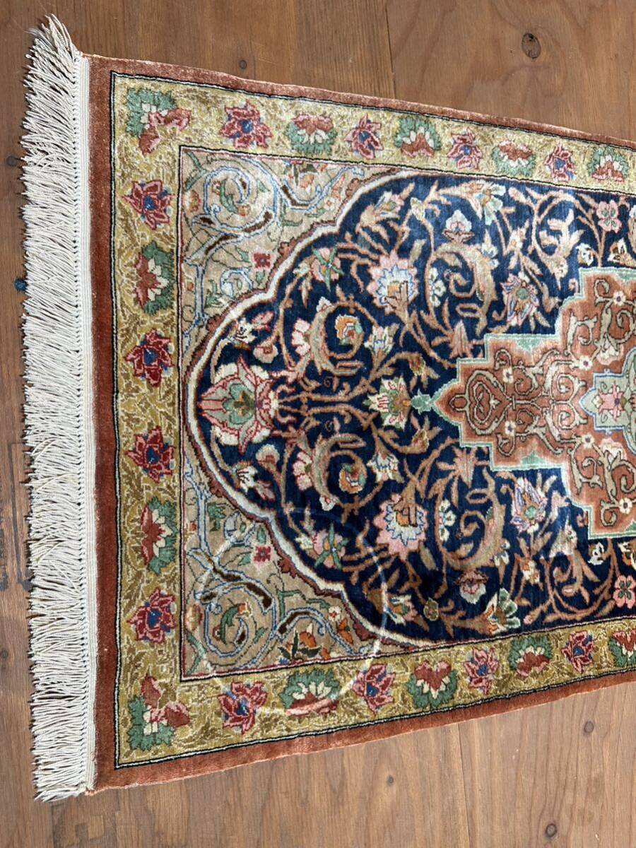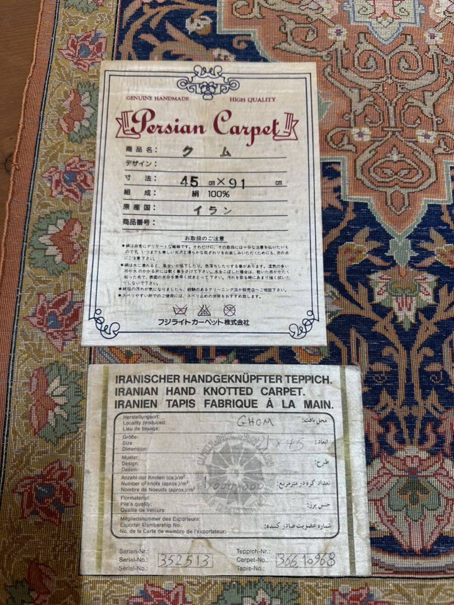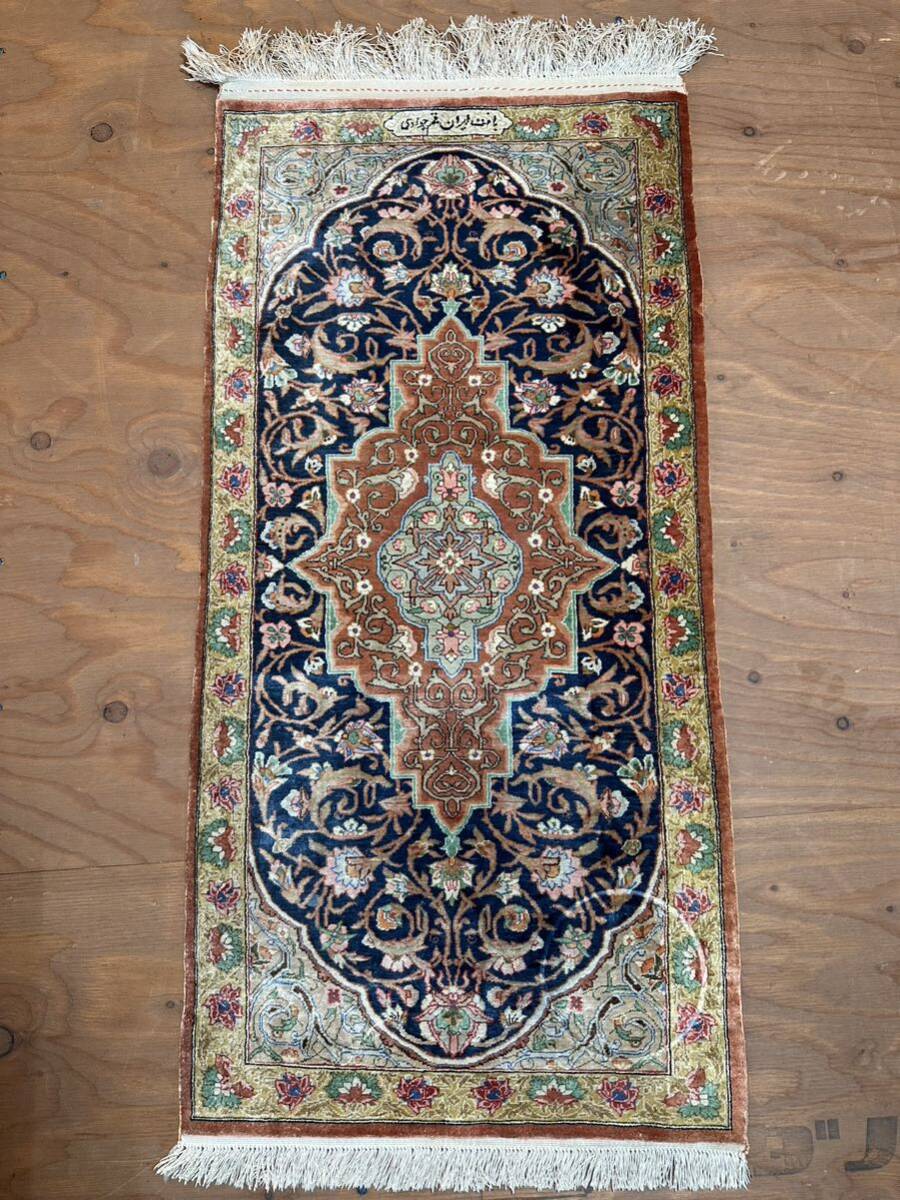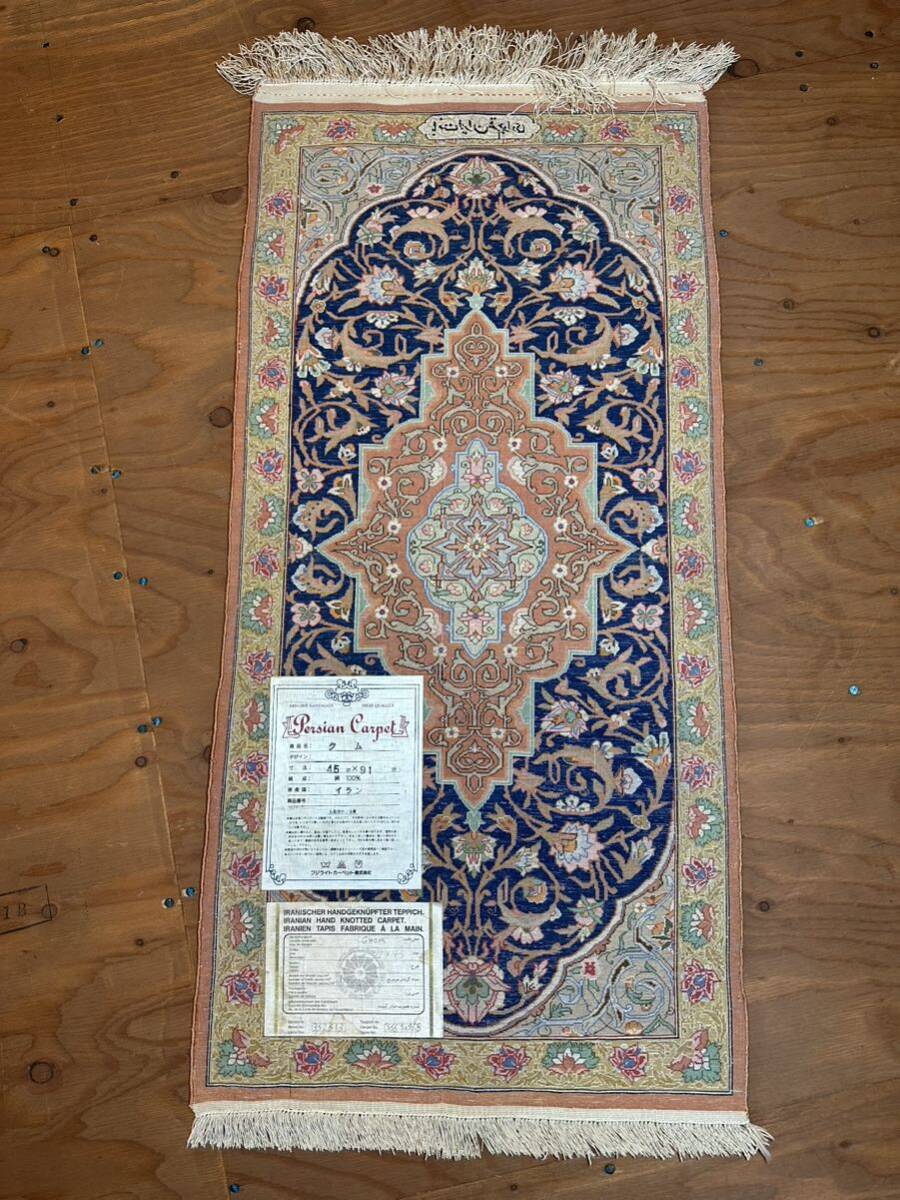 豪華 ペルシャ絨毯 イラン クム産 工房マーク有 シルク 110万ノット以上 メダリオン 総手織 91×45㎝ 玄関 マット ラグ J91