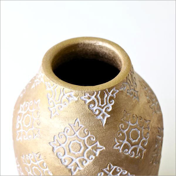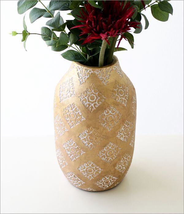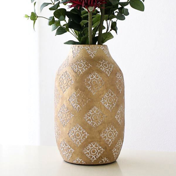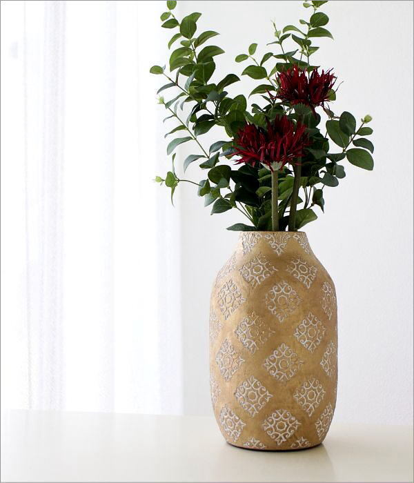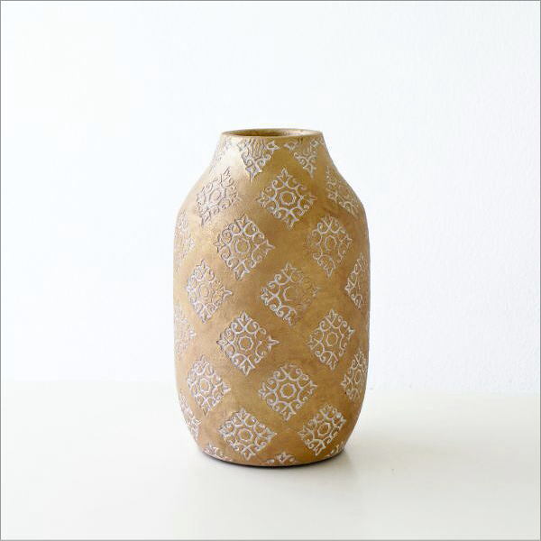 | レッドクレイ(赤粘土)を高温で焼き上げ 釉薬を何度も塗り重ねて仕上げる テラコッタ製のベースです 独自性、創造性をテーマにした 独特な柄や色合いは ハンドワークによるもので 凝った作りになっています 気軽に使える大きさの 上品なイメージの花瓶は 八角形をベースにした アラベスク調の型押し模様が綺麗に並んだ 凛とした佇まいが魅力です 商品名 : 陶器のベース MOROSアラベスク 商品番号 : sik5571 全体サイズ(cm) : 直径15×高さ26 材質 : 陶器(テラコッタ) 重量 : 2kg 生産国 : フィリピン ※防水加工が施されていますが水を長期間貯めたままにしないでください ※手作り品の為、模様・形・サイズ等に個体差があります ※商品の特性上、小さな欠けや傷はご容赦ください ※ディスプレイによる色の違いはご了承下さい |